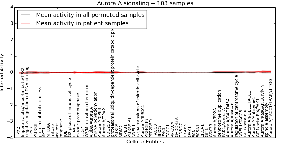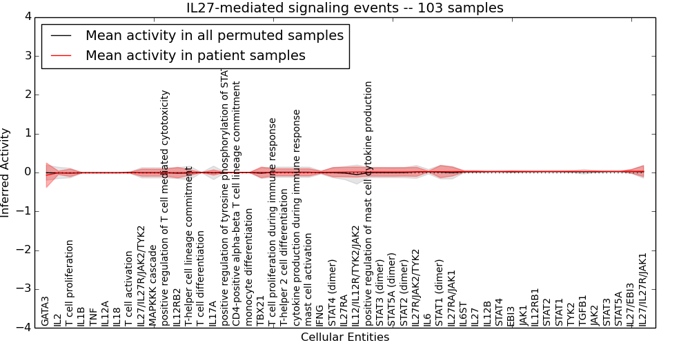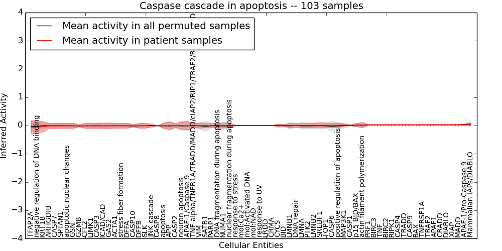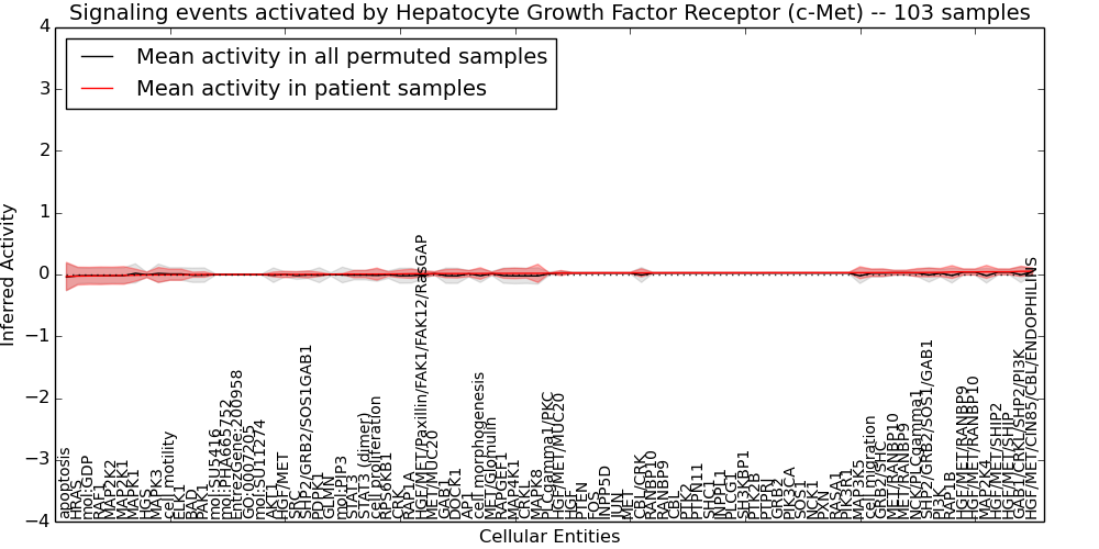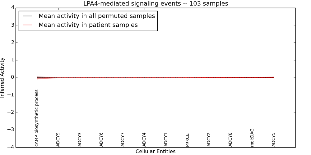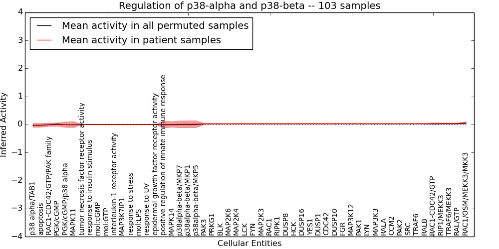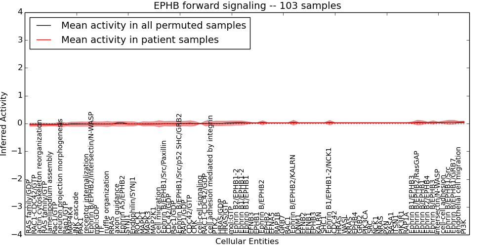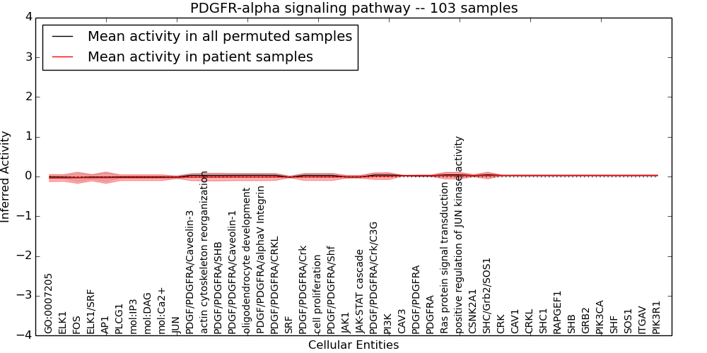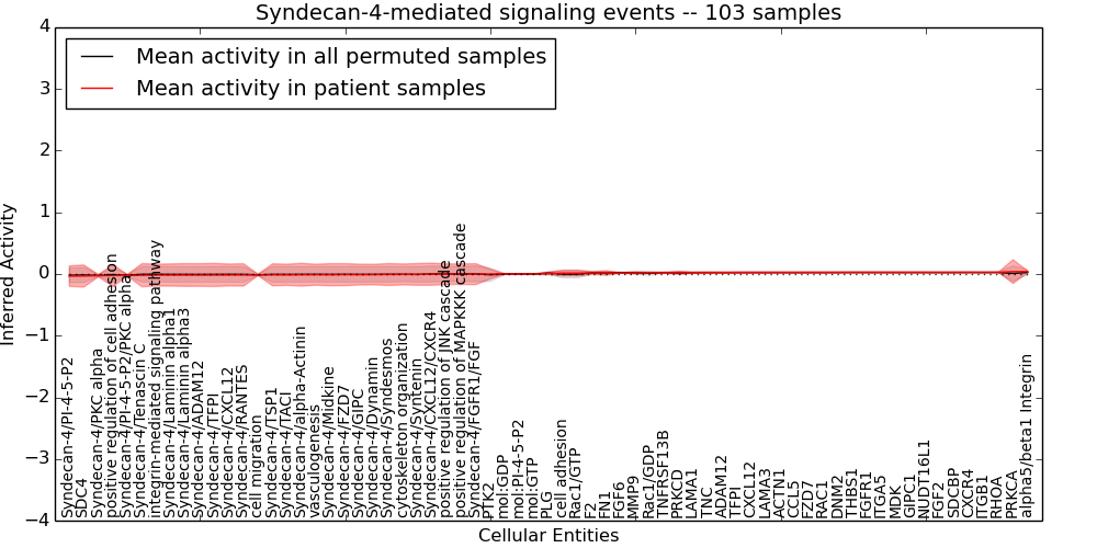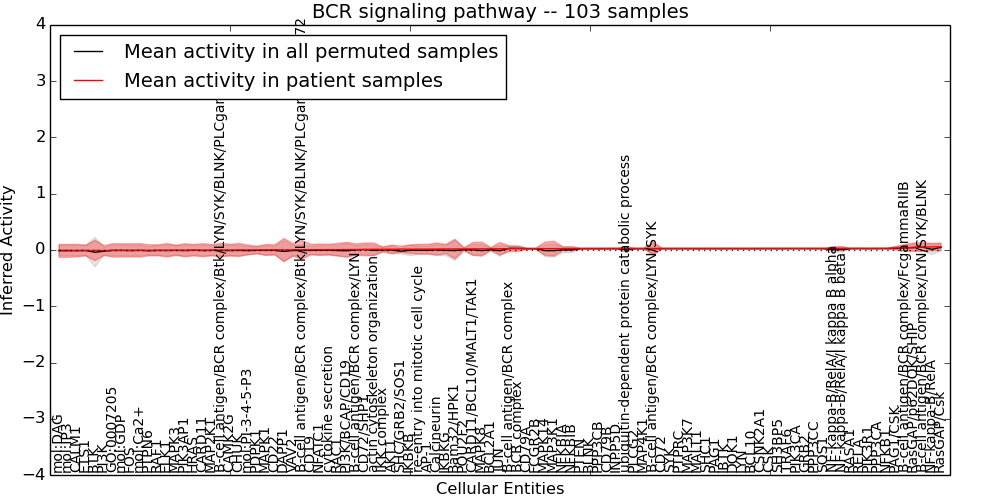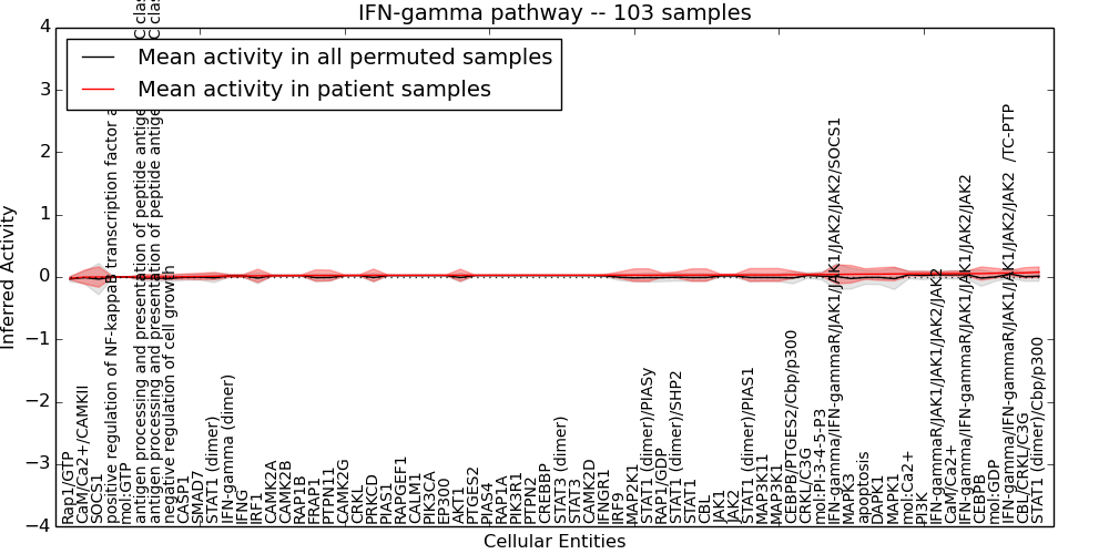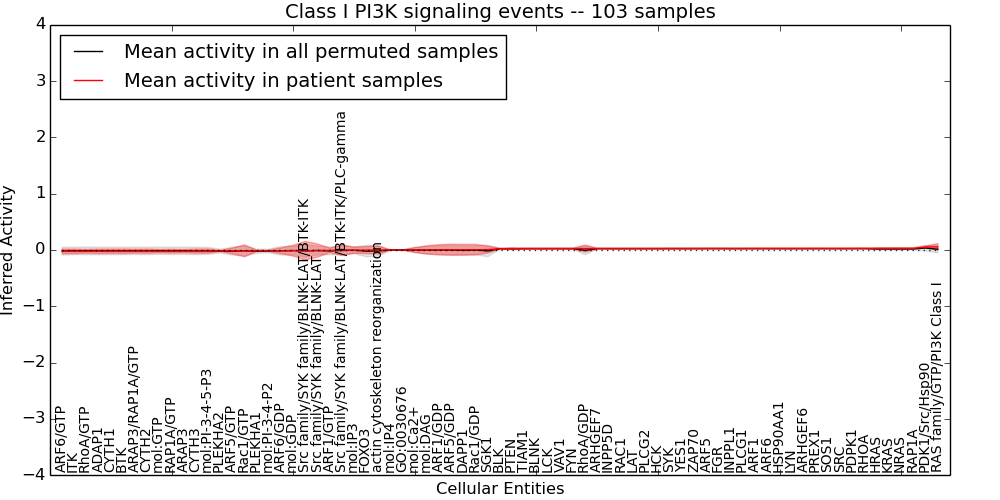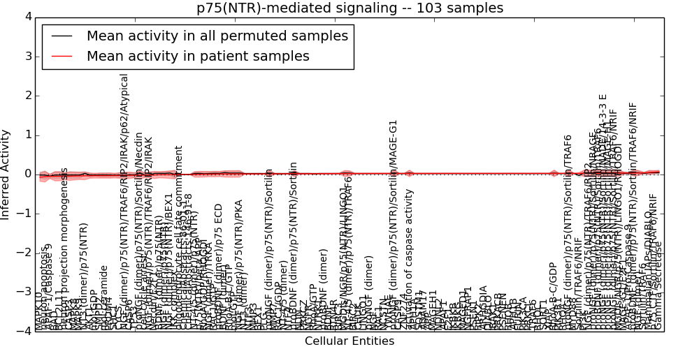 Figure S131. Get High-res Image This plot shows pathway concept perturbations across all samples against a permutation model. The concepts along the x-axis are sorted by lowest to highest mean activity for the real patient samples. Mean inferred activities are plotted along the y-axis as a colored band showing the average level and one standard deviation range. Real samples are shown in red and permuted samples in black.