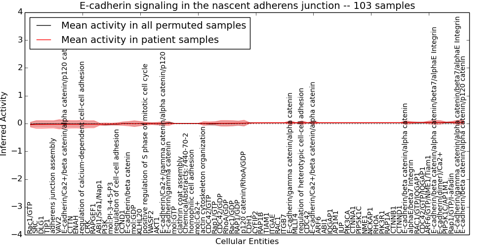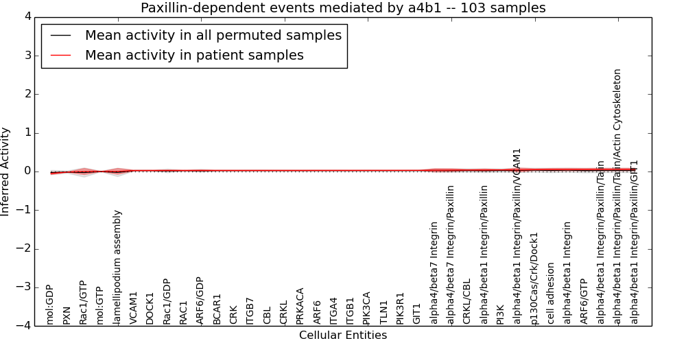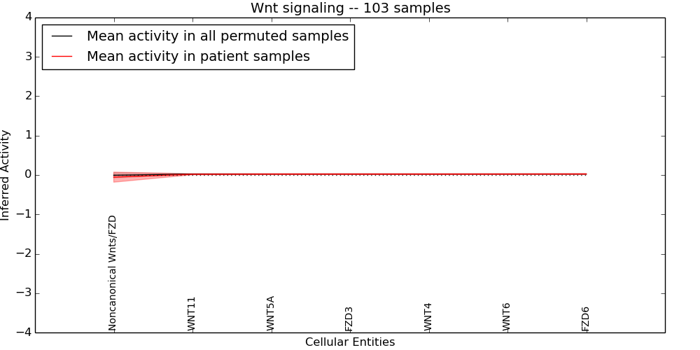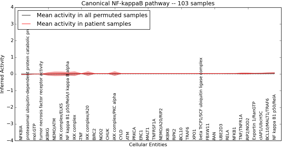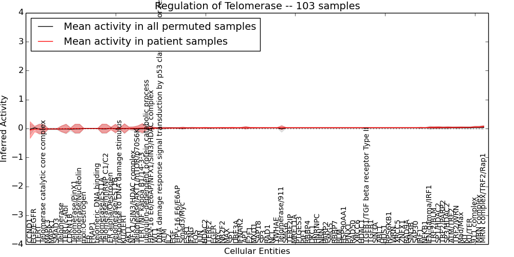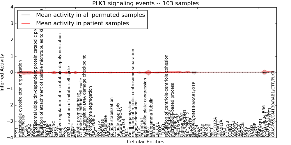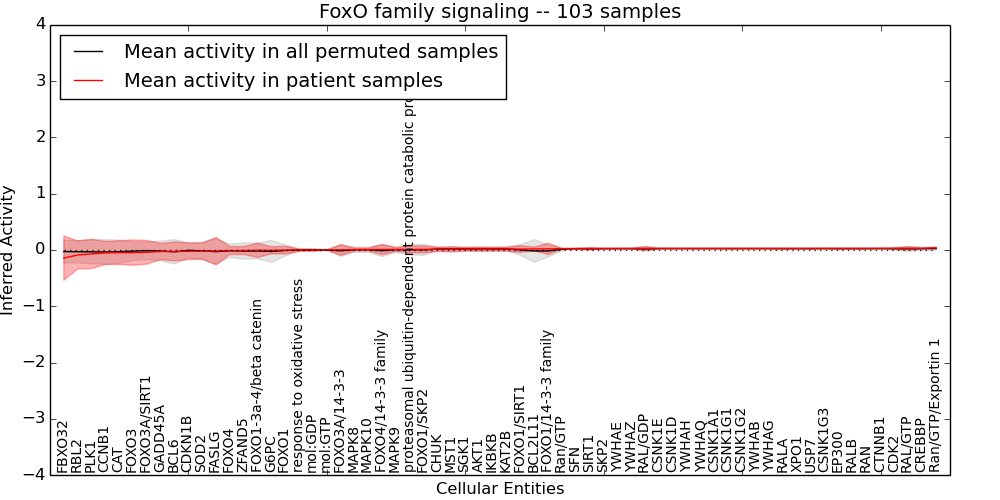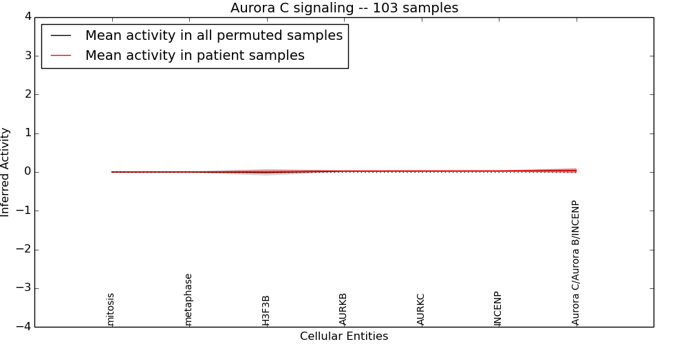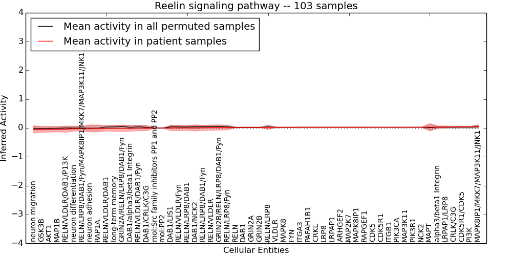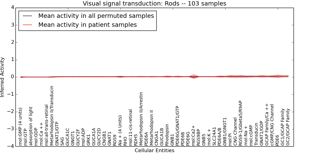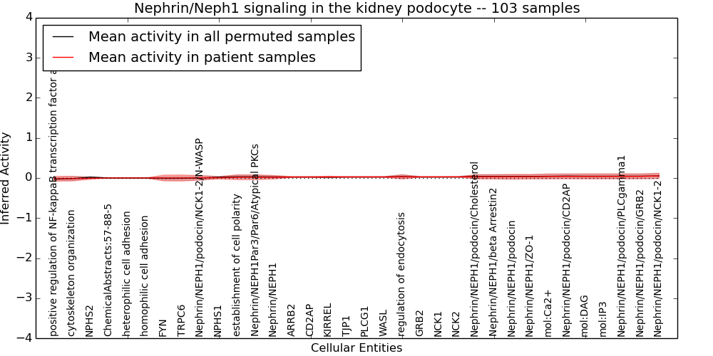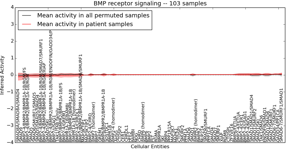 Figure S131. Get High-res Image This plot shows pathway concept perturbations across all samples against a permutation model. The concepts along the x-axis are sorted by lowest to highest mean activity for the real patient samples. Mean inferred activities are plotted along the y-axis as a colored band showing the average level and one standard deviation range. Real samples are shown in red and permuted samples in black.