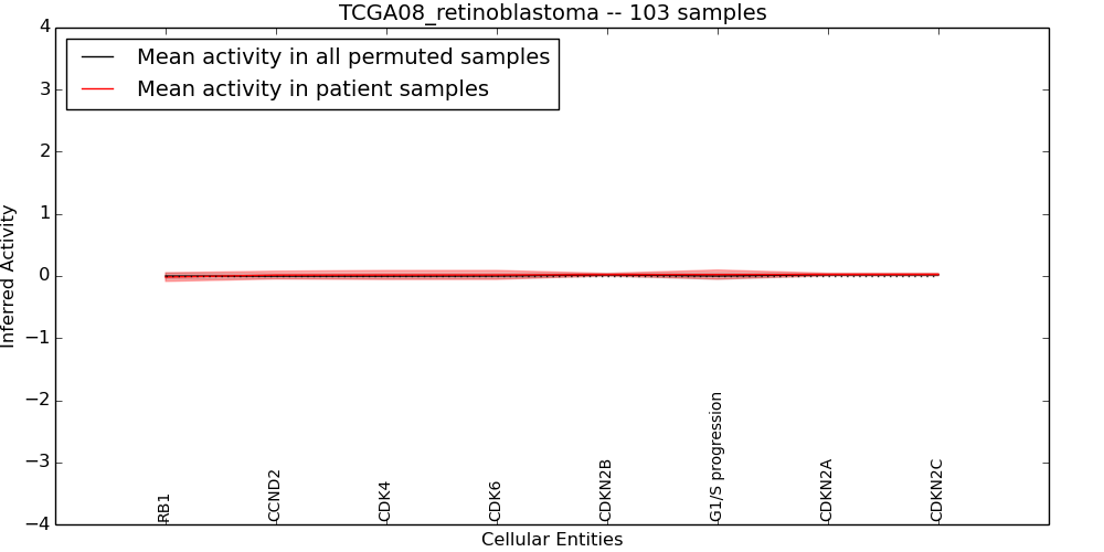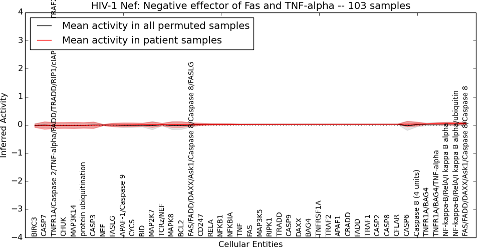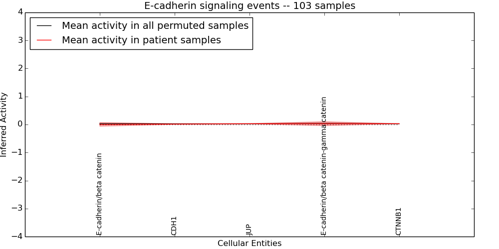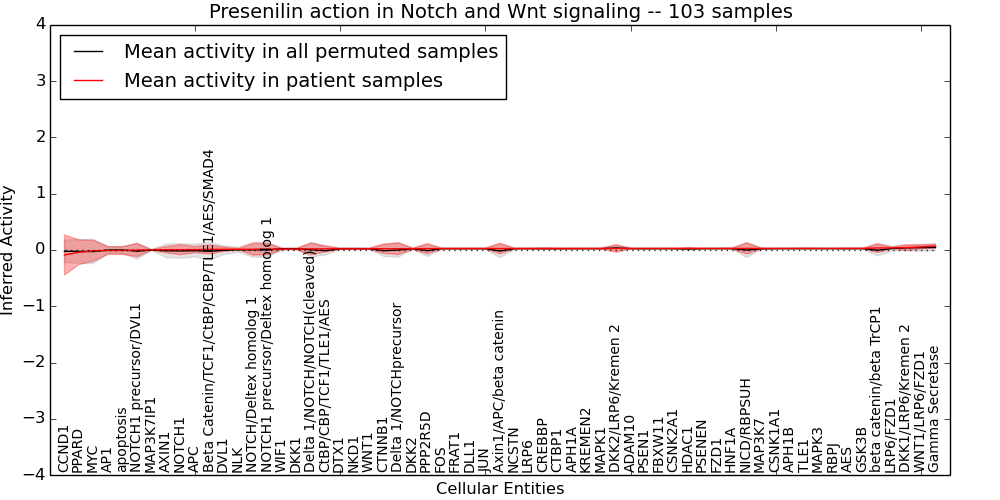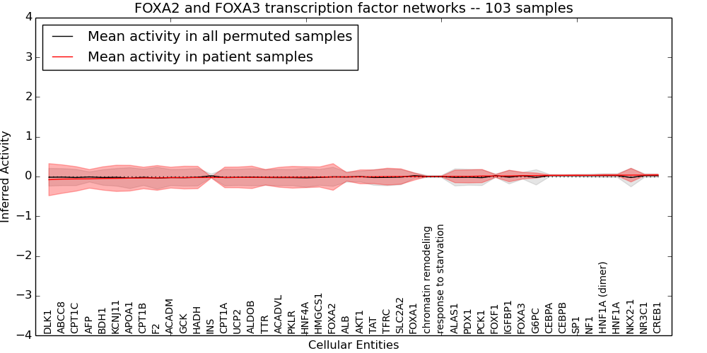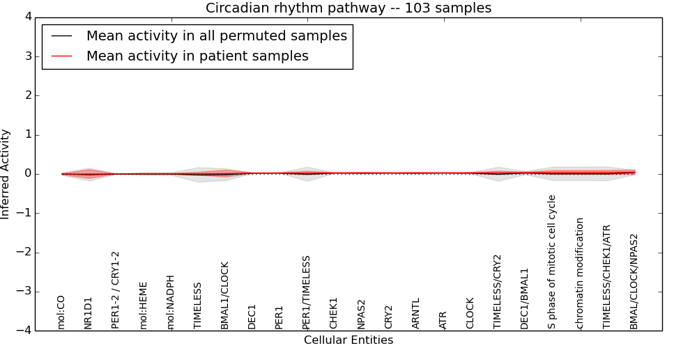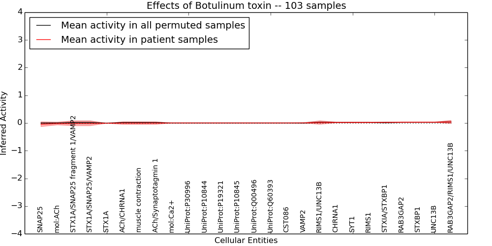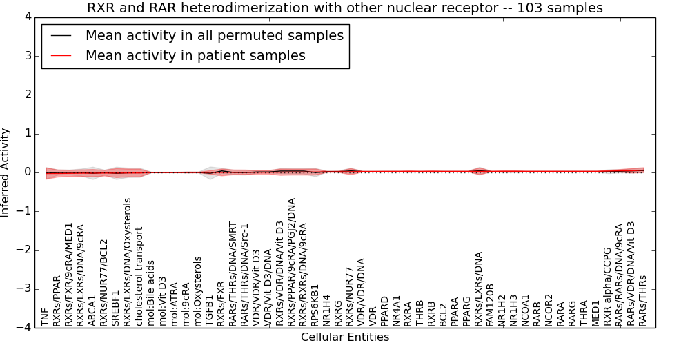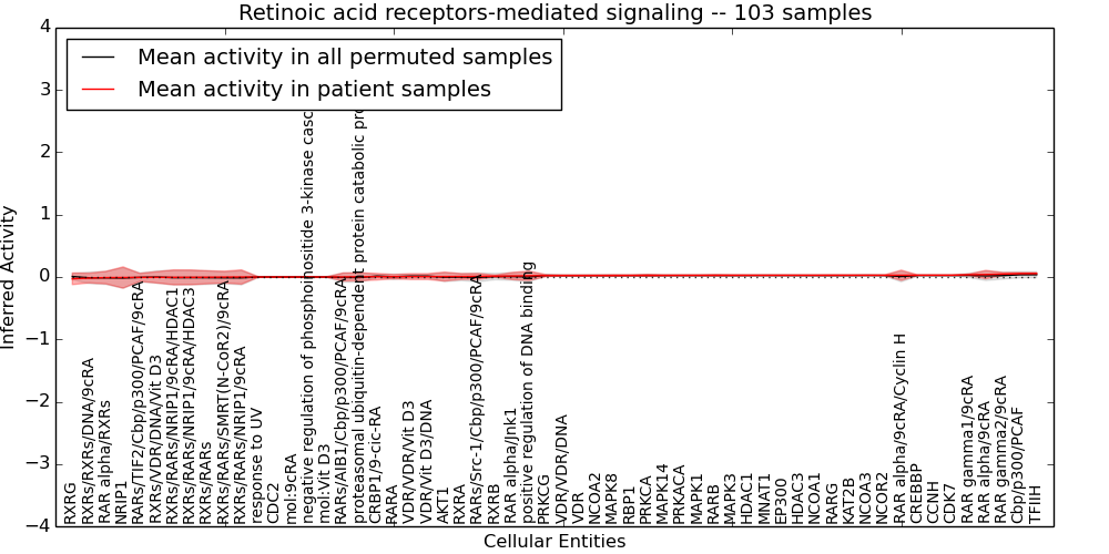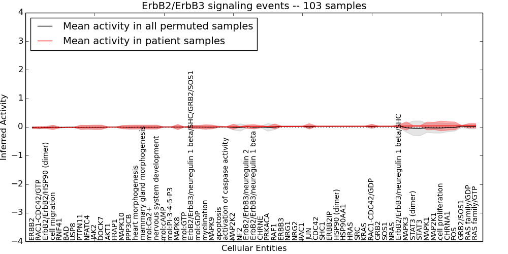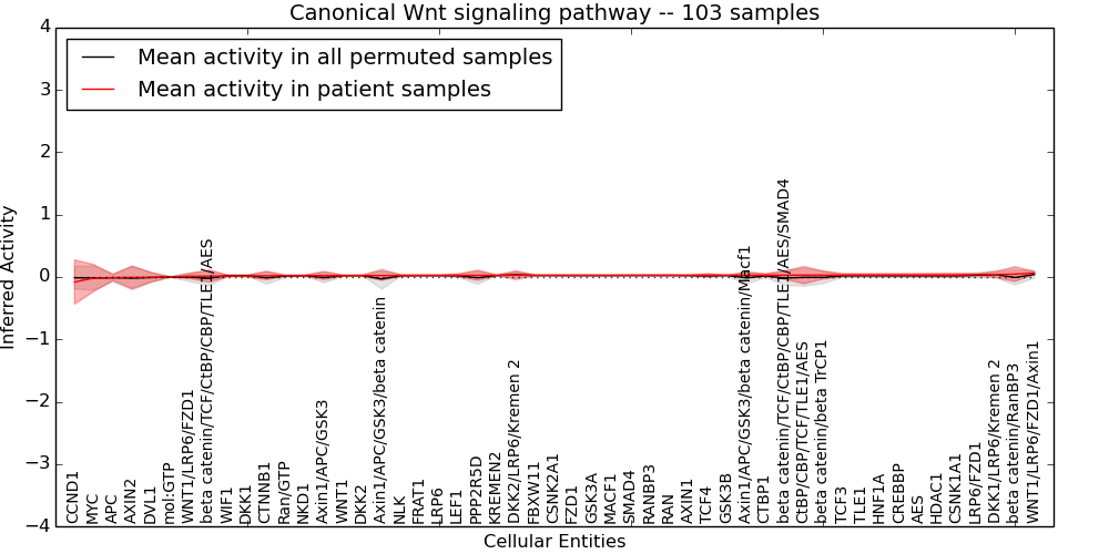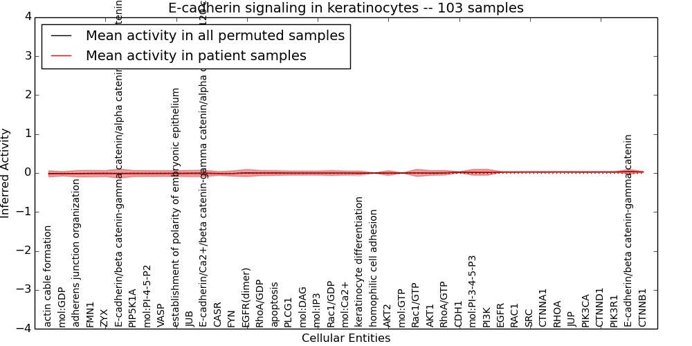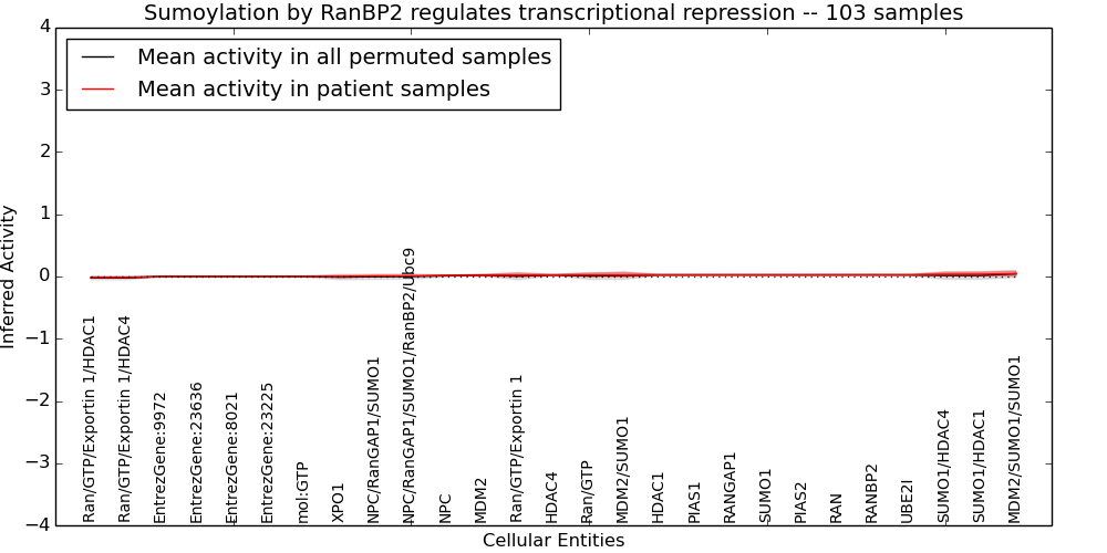 Figure S131. Get High-res Image This plot shows pathway concept perturbations across all samples against a permutation model. The concepts along the x-axis are sorted by lowest to highest mean activity for the real patient samples. Mean inferred activities are plotted along the y-axis as a colored band showing the average level and one standard deviation range. Real samples are shown in red and permuted samples in black.