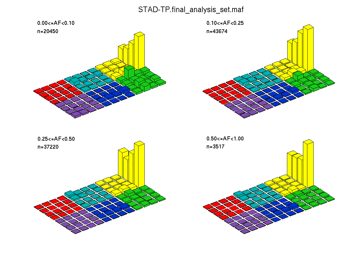 Figure 4.  Get High-res Image SNV Mutation rate lego plots for 4 slices of mutation allele fraction (0<=AF<0.1, 0.1<=AF<0.25, 0.25<=AF<0.5, & 0.5<=AF) . The color code and three-base context legends are the same as the previous figure. If this figure is blank, not enough information was provided in the MAF to generate it.
