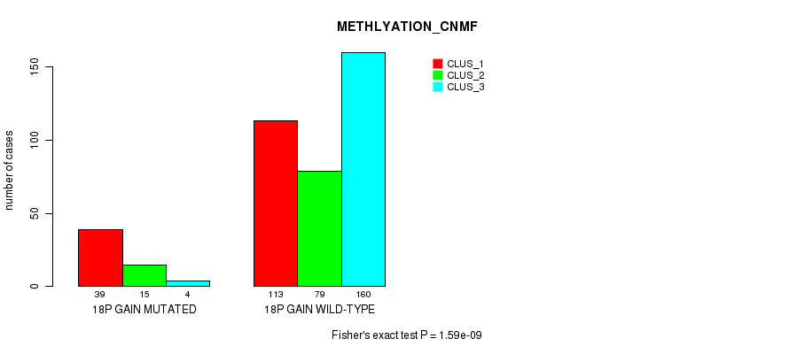 18p gain cnv correlated to 'CN_CNMF', 'METHLYATION_CNMF', 'MRNASEQ_CNMF', 'MRNASEQ_CHIERARCHICAL', 'MIRSEQ_CNMF', 'MIRSEQ_CHIERARCHICAL', 'MIRSEQ_MATURE_CNMF', and 'MIRSEQ_MATURE_CHIERARCHICAL'.