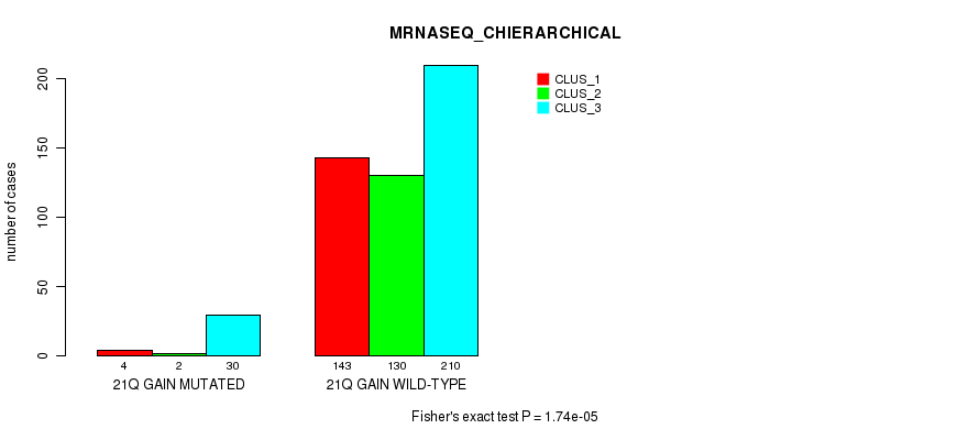 21q gain cnv correlated to 'CN_CNMF', 'MRNASEQ_CNMF', 'MRNASEQ_CHIERARCHICAL', 'MIRSEQ_CNMF', and 'MIRSEQ_CHIERARCHICAL'.