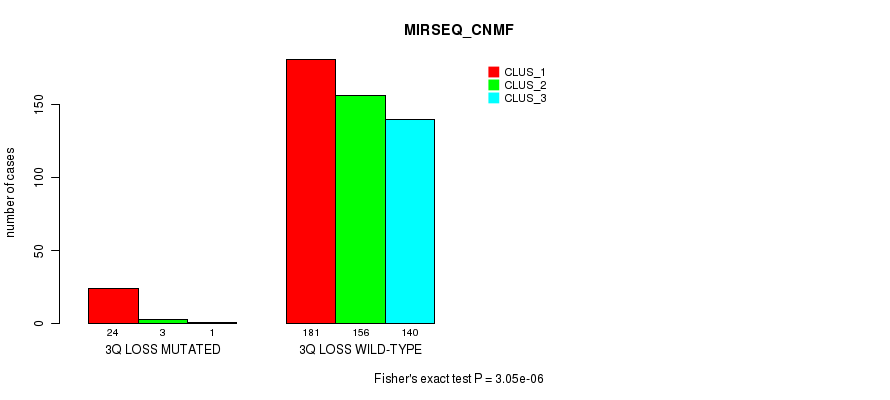 3q loss cnv correlated to 'CN_CNMF', 'METHLYATION_CNMF', 'MRNASEQ_CNMF', 'MRNASEQ_CHIERARCHICAL', and 'MIRSEQ_CNMF'.