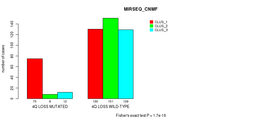 4q loss cnv correlated to 'CN_CNMF', 'METHLYATION_CNMF', 'MRNASEQ_CNMF', 'MRNASEQ_CHIERARCHICAL', 'MIRSEQ_CNMF', 'MIRSEQ_CHIERARCHICAL', 'MIRSEQ_MATURE_CNMF', and 'MIRSEQ_MATURE_CHIERARCHICAL'.