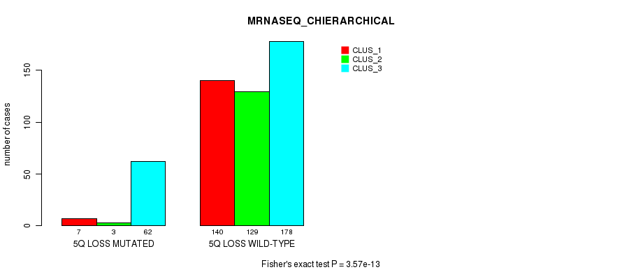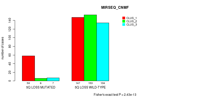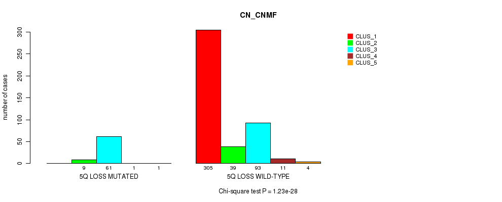 5q loss cnv correlated to 'CN_CNMF', 'METHLYATION_CNMF', 'MRNASEQ_CNMF', 'MRNASEQ_CHIERARCHICAL', 'MIRSEQ_CNMF', 'MIRSEQ_CHIERARCHICAL', 'MIRSEQ_MATURE_CNMF', and 'MIRSEQ_MATURE_CHIERARCHICAL'.