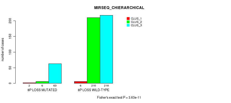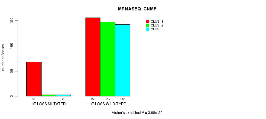 8p loss cnv correlated to 'CN_CNMF', 'METHLYATION_CNMF', 'MRNASEQ_CNMF', 'MRNASEQ_CHIERARCHICAL', 'MIRSEQ_CNMF', 'MIRSEQ_CHIERARCHICAL', 'MIRSEQ_MATURE_CNMF', and 'MIRSEQ_MATURE_CHIERARCHICAL'.
