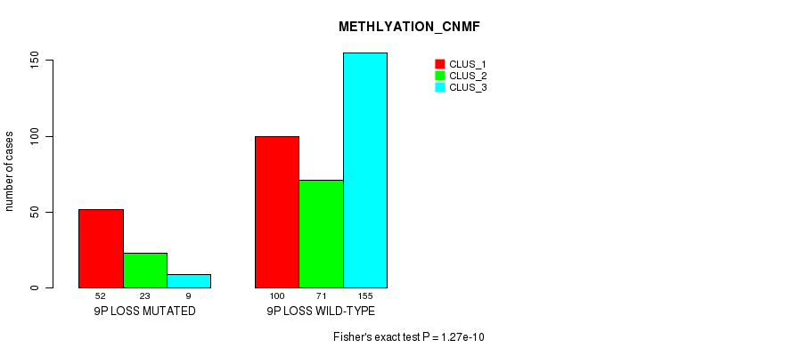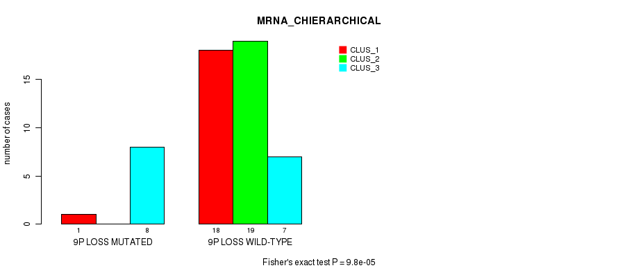 9p loss cnv correlated to 'MRNA_CHIERARCHICAL', 'CN_CNMF', 'METHLYATION_CNMF', 'MRNASEQ_CNMF', 'MRNASEQ_CHIERARCHICAL', 'MIRSEQ_CNMF', 'MIRSEQ_CHIERARCHICAL', and 'MIRSEQ_MATURE_CHIERARCHICAL'.