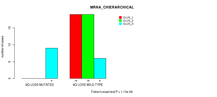 9q loss cnv correlated to 'MRNA_CNMF', 'MRNA_CHIERARCHICAL', 'CN_CNMF', 'METHLYATION_CNMF', 'MRNASEQ_CNMF', 'MRNASEQ_CHIERARCHICAL', 'MIRSEQ_CNMF', 'MIRSEQ_CHIERARCHICAL', and 'MIRSEQ_MATURE_CHIERARCHICAL'.