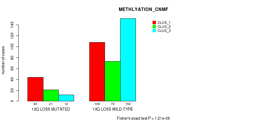 13q loss cnv correlated to 'CN_CNMF', 'METHLYATION_CNMF', 'MRNASEQ_CNMF', 'MRNASEQ_CHIERARCHICAL', 'MIRSEQ_CNMF', and 'MIRSEQ_CHIERARCHICAL'.