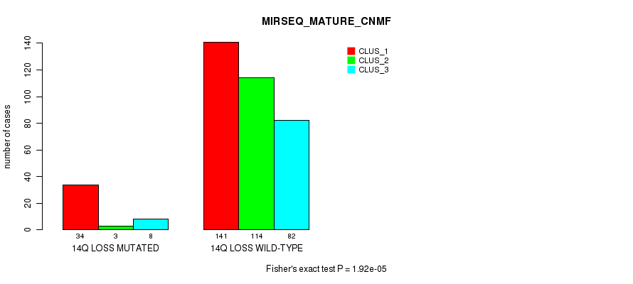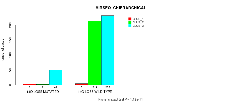14q loss cnv correlated to 'MRNA_CHIERARCHICAL', 'CN_CNMF', 'METHLYATION_CNMF', 'MRNASEQ_CNMF', 'MRNASEQ_CHIERARCHICAL', 'MIRSEQ_CNMF', 'MIRSEQ_CHIERARCHICAL', 'MIRSEQ_MATURE_CNMF', and 'MIRSEQ_MATURE_CHIERARCHICAL'.