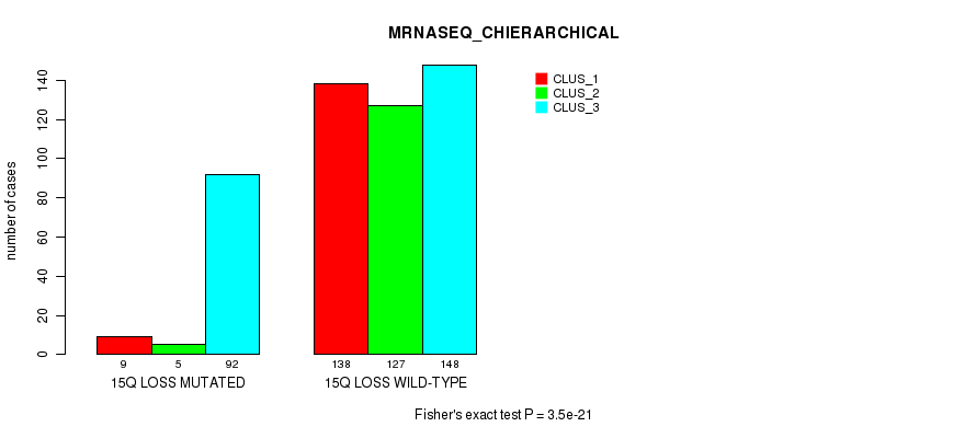 15q loss cnv correlated to 'MRNA_CHIERARCHICAL', 'CN_CNMF', 'METHLYATION_CNMF', 'RPPA_CNMF', 'MRNASEQ_CNMF', 'MRNASEQ_CHIERARCHICAL', 'MIRSEQ_CNMF', 'MIRSEQ_CHIERARCHICAL', 'MIRSEQ_MATURE_CNMF', and 'MIRSEQ_MATURE_CHIERARCHICAL'.