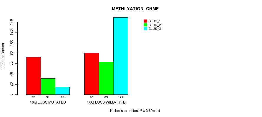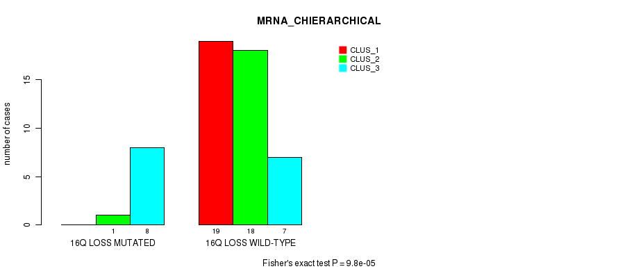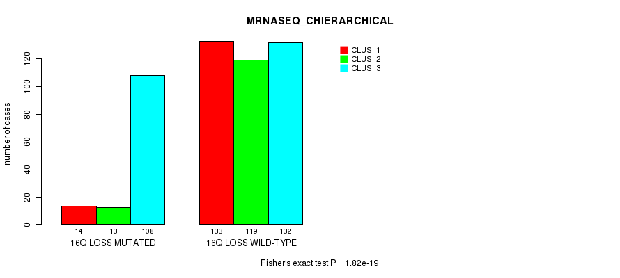 16q loss cnv correlated to 'MRNA_CHIERARCHICAL', 'CN_CNMF', 'METHLYATION_CNMF', 'MRNASEQ_CNMF', 'MRNASEQ_CHIERARCHICAL', 'MIRSEQ_CNMF', 'MIRSEQ_CHIERARCHICAL', 'MIRSEQ_MATURE_CNMF', and 'MIRSEQ_MATURE_CHIERARCHICAL'.