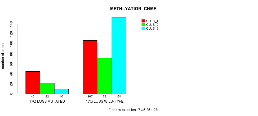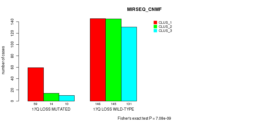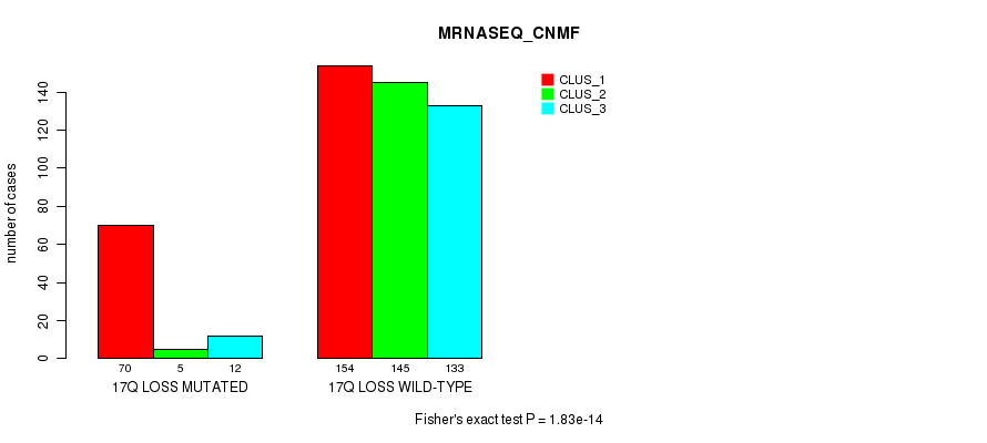 17q loss cnv correlated to 'MRNA_CHIERARCHICAL', 'CN_CNMF', 'METHLYATION_CNMF', 'MRNASEQ_CNMF', 'MRNASEQ_CHIERARCHICAL', 'MIRSEQ_CNMF', and 'MIRSEQ_CHIERARCHICAL'.
