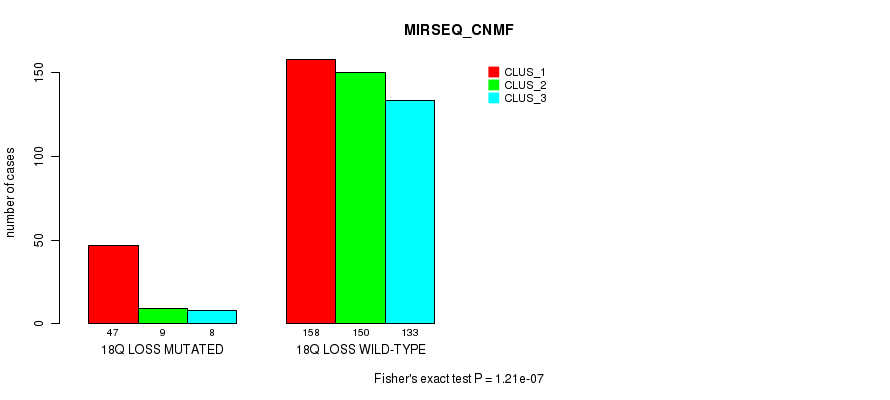 18q loss cnv correlated to 'CN_CNMF', 'METHLYATION_CNMF', 'MRNASEQ_CNMF', 'MRNASEQ_CHIERARCHICAL', 'MIRSEQ_CNMF', and 'MIRSEQ_CHIERARCHICAL'.