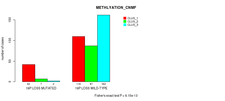 19p loss cnv correlated to 'CN_CNMF', 'METHLYATION_CNMF', 'MRNASEQ_CNMF', 'MRNASEQ_CHIERARCHICAL', 'MIRSEQ_CNMF', 'MIRSEQ_CHIERARCHICAL', 'MIRSEQ_MATURE_CNMF', and 'MIRSEQ_MATURE_CHIERARCHICAL'.