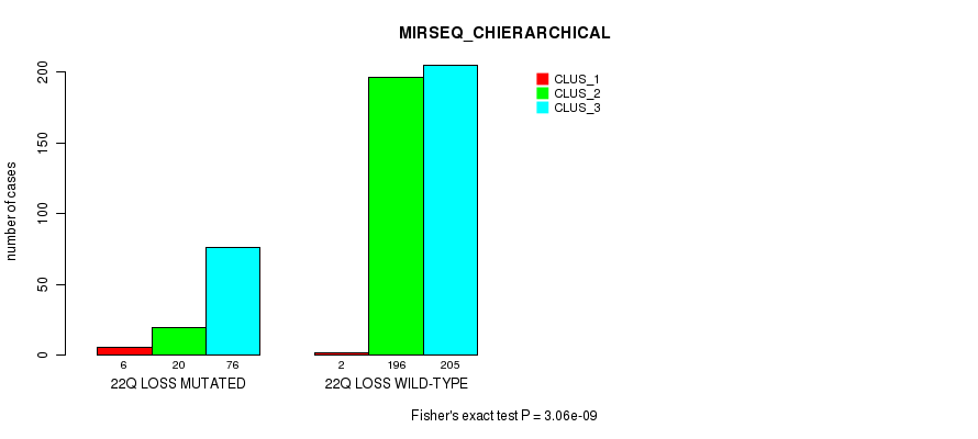 Figure S404. Get High-res Image Gene #79: '22q loss' versus Molecular Subtype #10: 'MIRSEQ_CHIERARCHICAL'