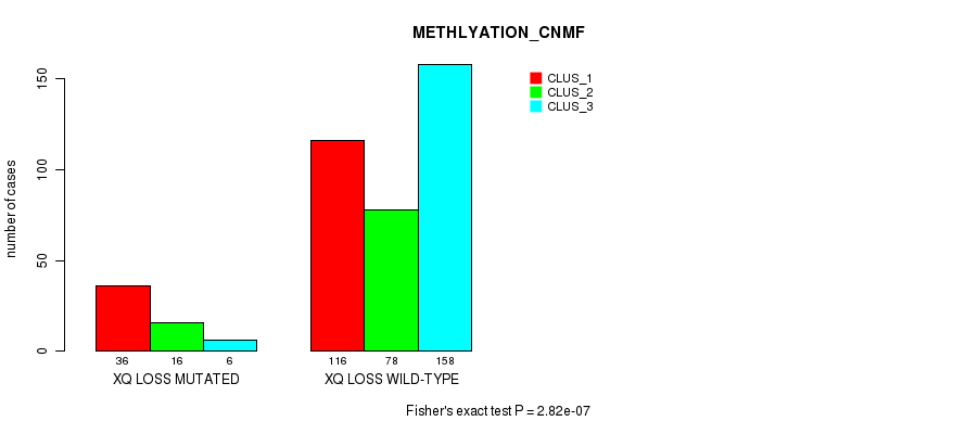 xq loss cnv correlated to 'CN_CNMF', 'METHLYATION_CNMF', 'RPPA_CNMF', 'MRNASEQ_CNMF', 'MRNASEQ_CHIERARCHICAL', 'MIRSEQ_CNMF', 'MIRSEQ_CHIERARCHICAL', and 'MIRSEQ_MATURE_CHIERARCHICAL'.