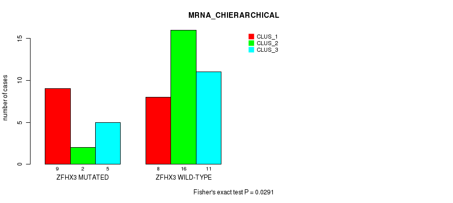 Figure S91. Get High-res Image Gene #32: 'ZFHX3 MUTATION STATUS' versus Molecular Subtype #2: 'MRNA_CHIERARCHICAL'