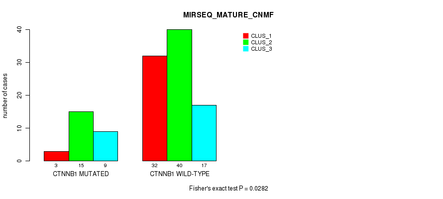 CTNNB1 mutation correlated to 'MRNA_CNMF', 'CN_CNMF', 'RPPA_CNMF', 'MRNASEQ_CNMF', 'MRNASEQ_CHIERARCHICAL', and 'MIRSEQ_CNMF'.