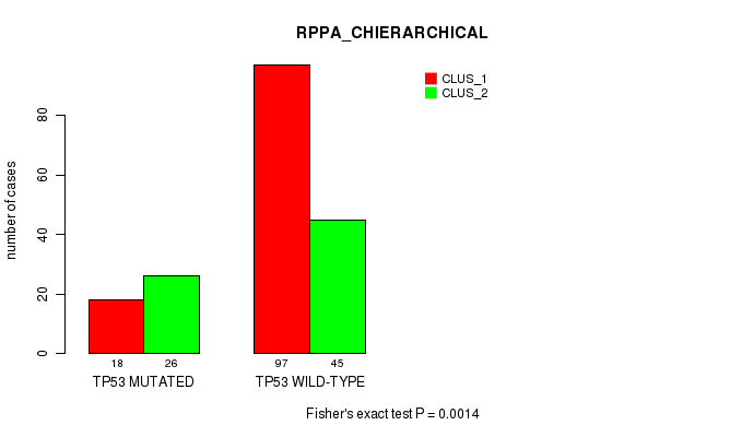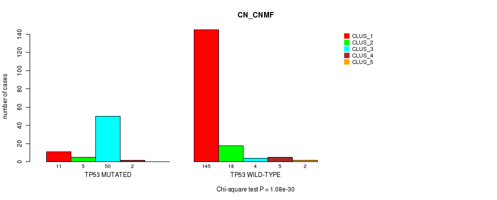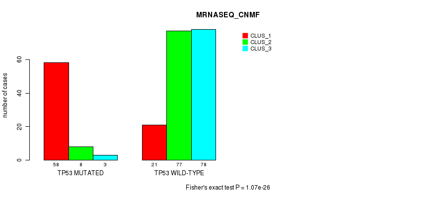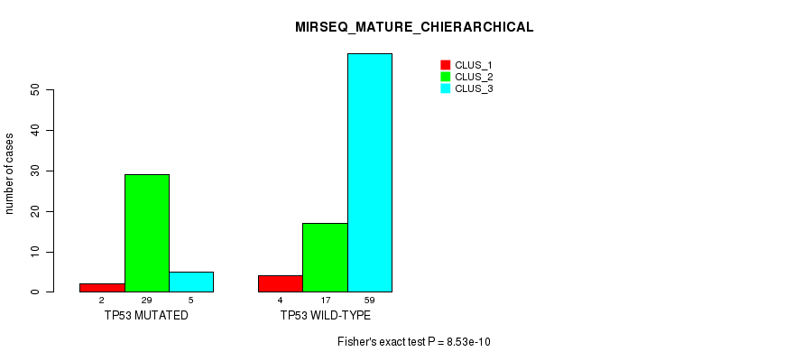 TP53 mutation correlated to 'MRNA_CNMF', 'MRNA_CHIERARCHICAL', 'CN_CNMF', 'METHLYATION_CNMF', 'RPPA_CNMF', 'MRNASEQ_CNMF', 'MRNASEQ_CHIERARCHICAL', 'MIRSEQ_CNMF', 'MIRSEQ_CHIERARCHICAL', 'MIRSEQ_MATURE_CNMF', and 'MIRSEQ_MATURE_CHIERARCHICAL'.