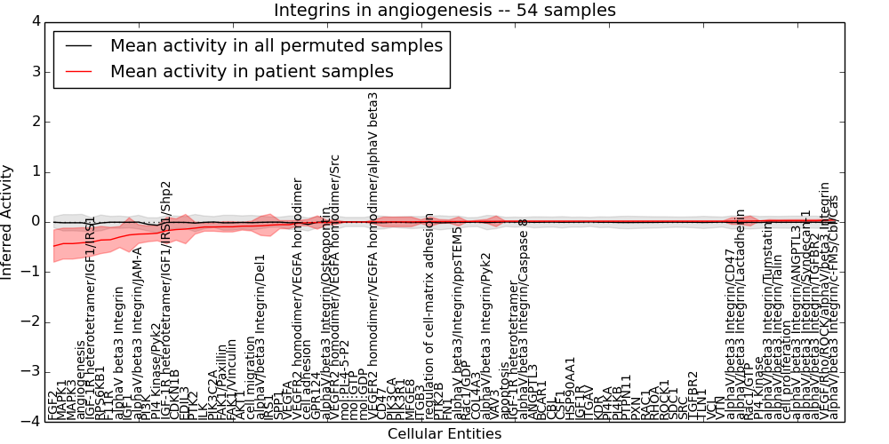 Figure S131.  Get High-res Image This plot shows pathway concept perturbations across all samples against a permutation model. The concepts along the x-axis are sorted by lowest to highest mean activity for the real patient samples. Mean inferred activities are plotted along the y-axis as a colored band showing the average level and one standard deviation range. Real samples are shown in red and permuted samples in black.