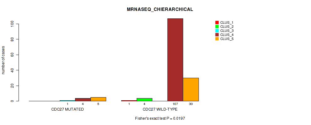 Testing the association between mutation status of 27 genes and 9 molecular subtypes across 154 patients, 11 significant findings detected with P value < 0.05 and Q value < 0.25.
