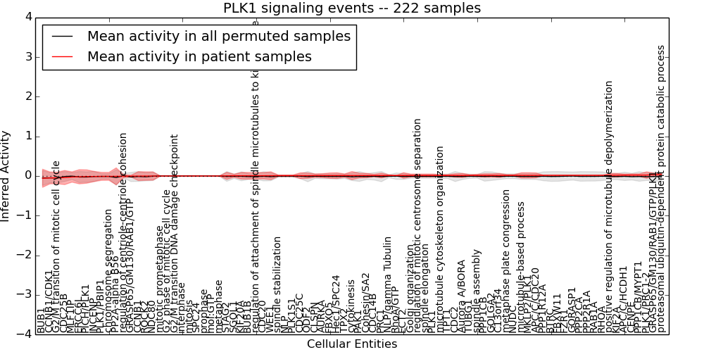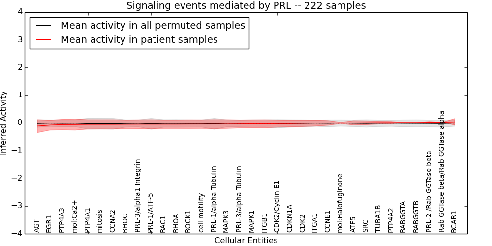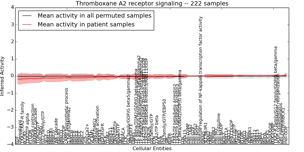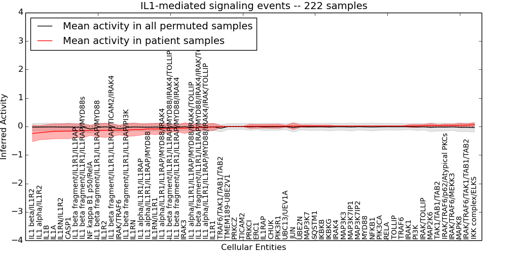 Figure S131. Get High-res Image This plot shows pathway concept perturbations across all samples against a permutation model. The concepts along the x-axis are sorted by lowest to highest mean activity for the real patient samples. Mean inferred activities are plotted along the y-axis as a colored band showing the average level and one standard deviation range. Real samples are shown in red and permuted samples in black.