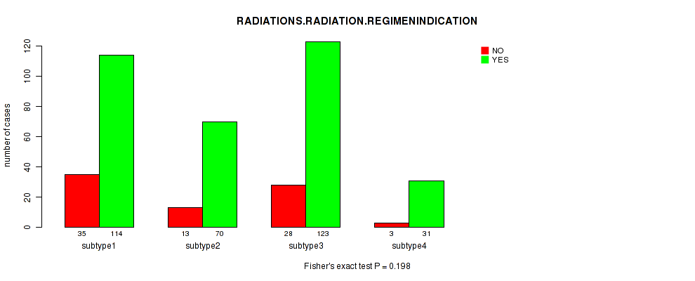 Figure S118. Get High-res Image Clustering Approach #10: 'MIRseq Mature cHierClus subtypes' versus Clinical Feature #9: 'RADIATIONS.RADIATION.REGIMENINDICATION'