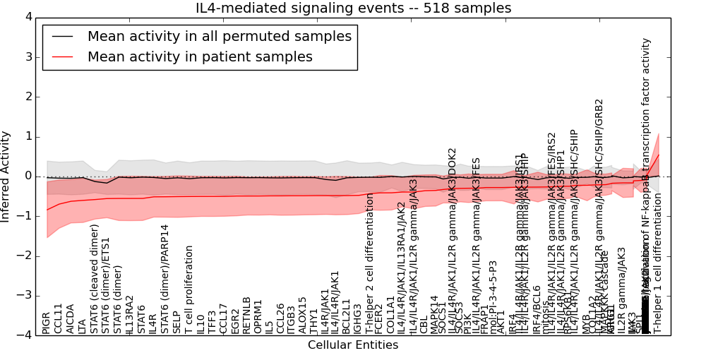 Figure S131. Get High-res Image This plot shows pathway concept perturbations across all samples against a permutation model. The concepts along the x-axis are sorted by lowest to highest mean activity for the real patient samples. Mean inferred activities are plotted along the y-axis as a colored band showing the average level and one standard deviation range. Real samples are shown in red and permuted samples in black.