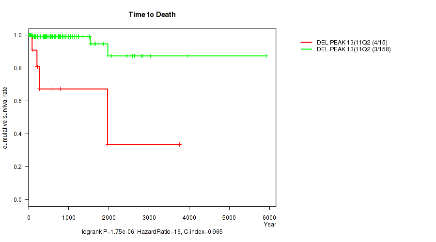 Figure S19. Get High-res Image Gene #19: 'del_11q22.3' versus Clinical Feature #1: 'Time to Death'
