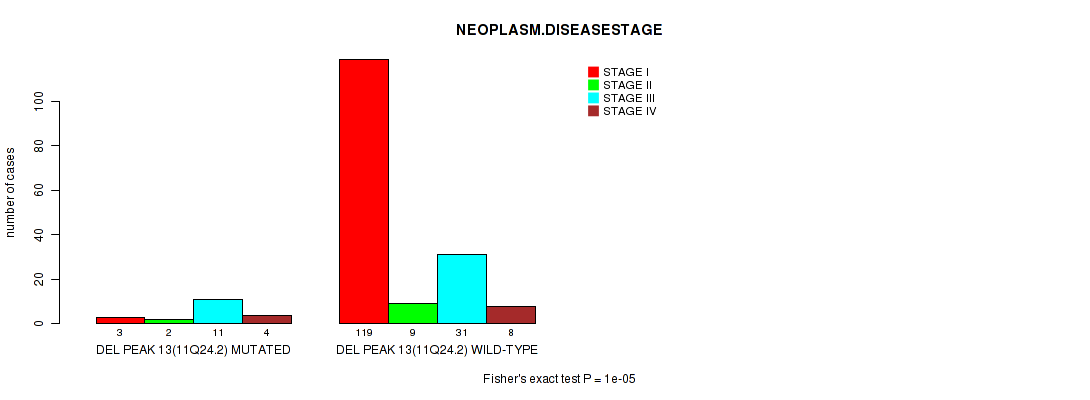 Figure S23. Get High-res Image Gene #20: 'del_11q24.2' versus Clinical Feature #3: 'NEOPLASM.DISEASESTAGE'