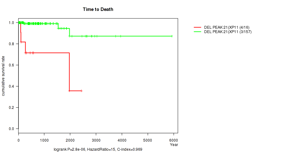 Figure S34. Get High-res Image Gene #28: 'del_xp11.22' versus Clinical Feature #1: 'Time to Death'