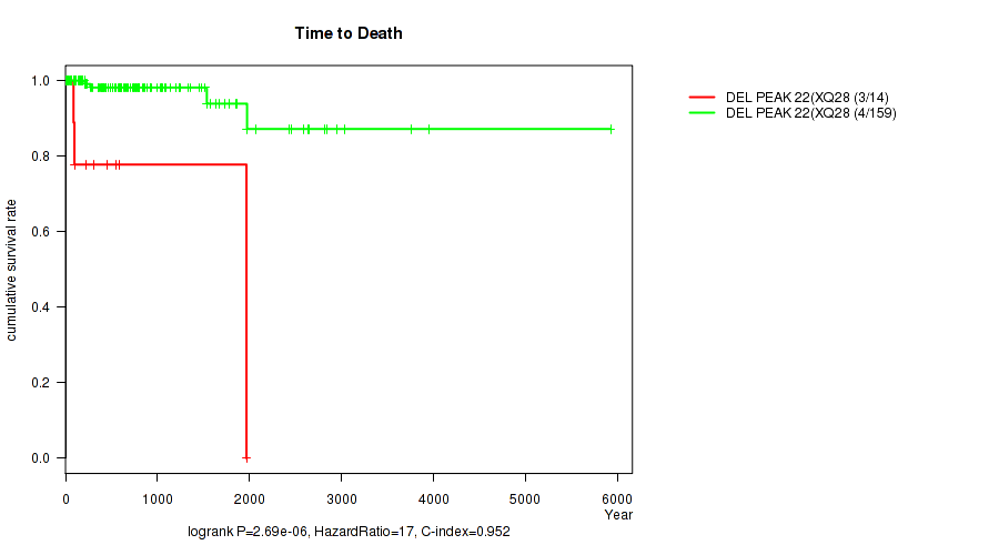 Table S34. Gene #28: 'del_xp11.22' versus Clinical Feature #1: 'Time to Death'