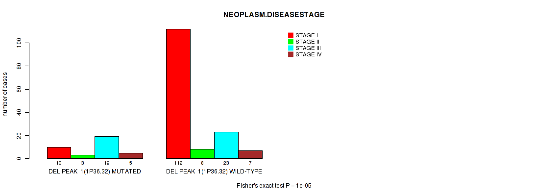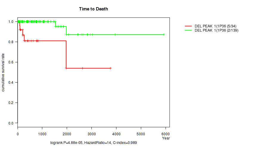 del_1p36.32 cnv correlated to 'Time to Death', 'NEOPLASM.DISEASESTAGE', and 'PATHOLOGY.T.STAGE'.