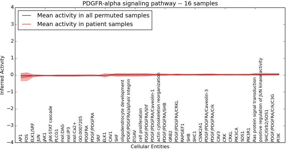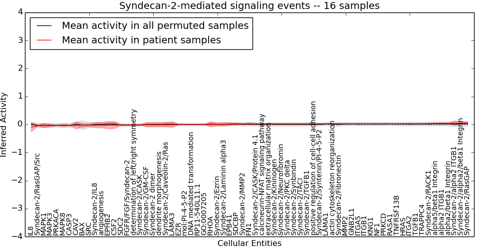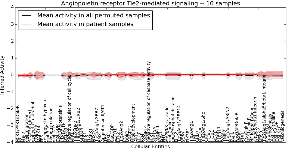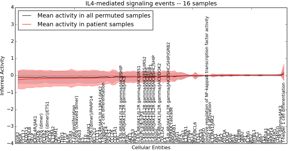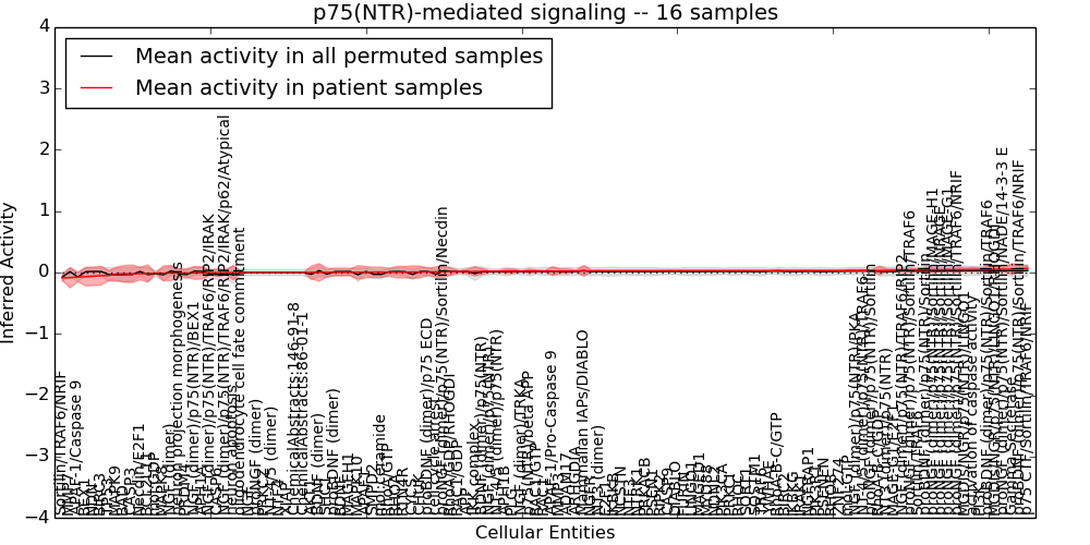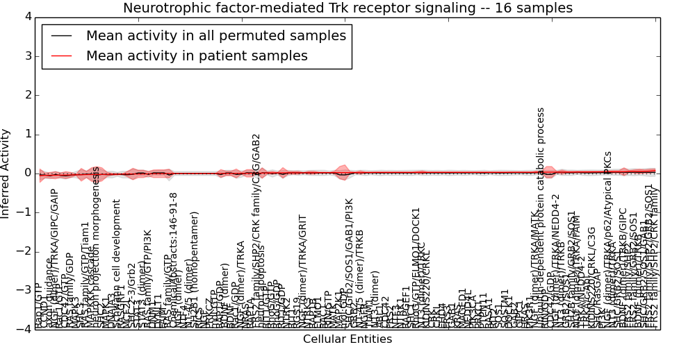 Figure S131. Get High-res Image This plot shows pathway concept perturbations across all samples against a permutation model. The concepts along the x-axis are sorted by lowest to highest mean activity for the real patient samples. Mean inferred activities are plotted along the y-axis as a colored band showing the average level and one standard deviation range. Real samples are shown in red and permuted samples in black.