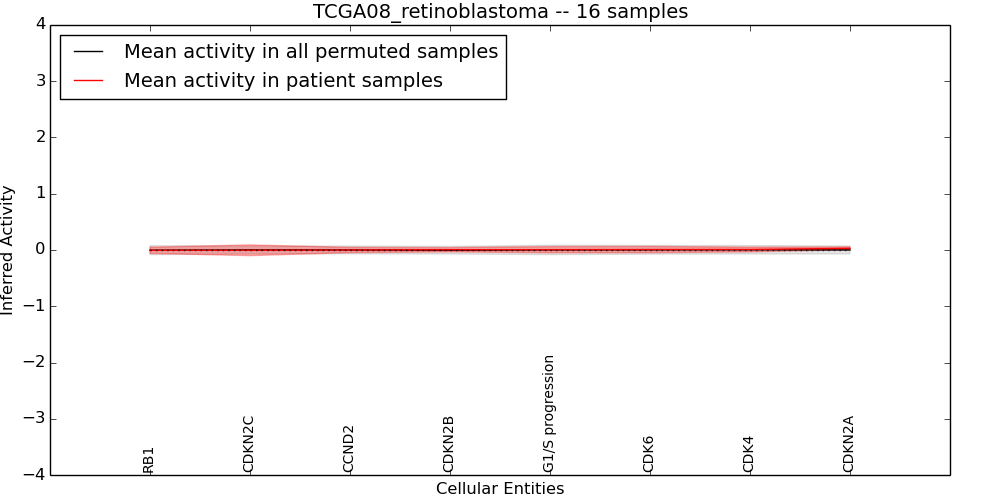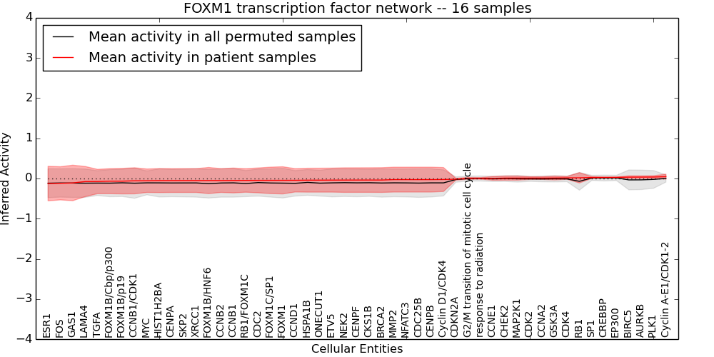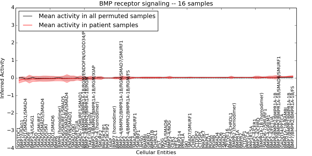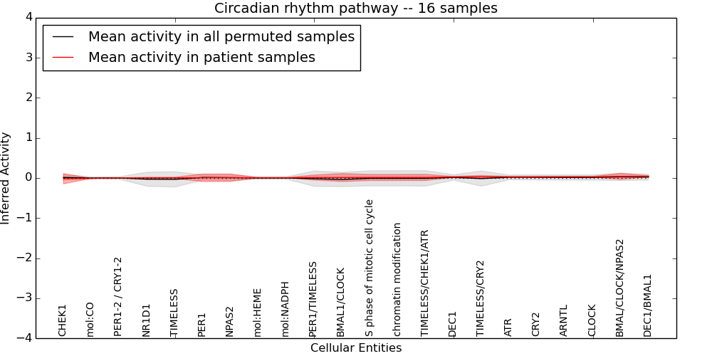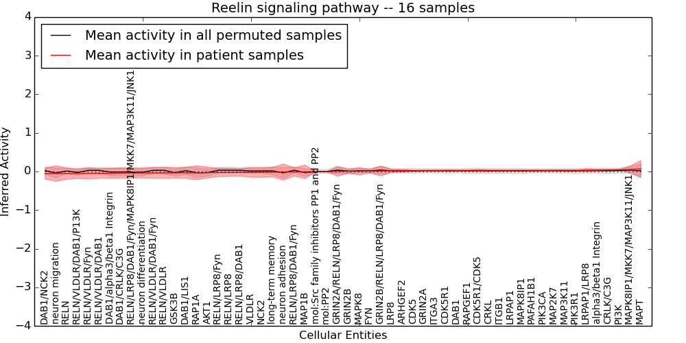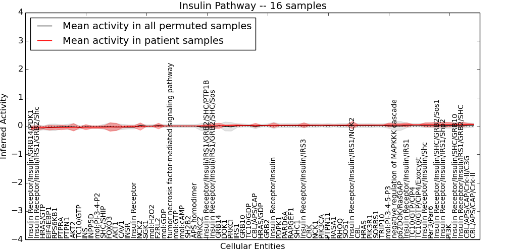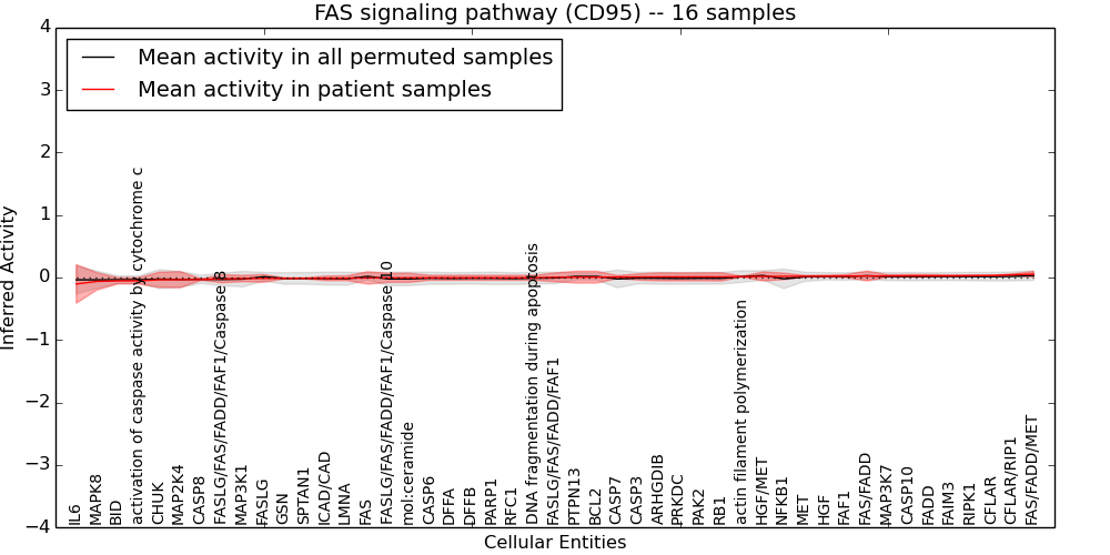 Figure S131. Get High-res Image This plot shows pathway concept perturbations across all samples against a permutation model. The concepts along the x-axis are sorted by lowest to highest mean activity for the real patient samples. Mean inferred activities are plotted along the y-axis as a colored band showing the average level and one standard deviation range. Real samples are shown in red and permuted samples in black.