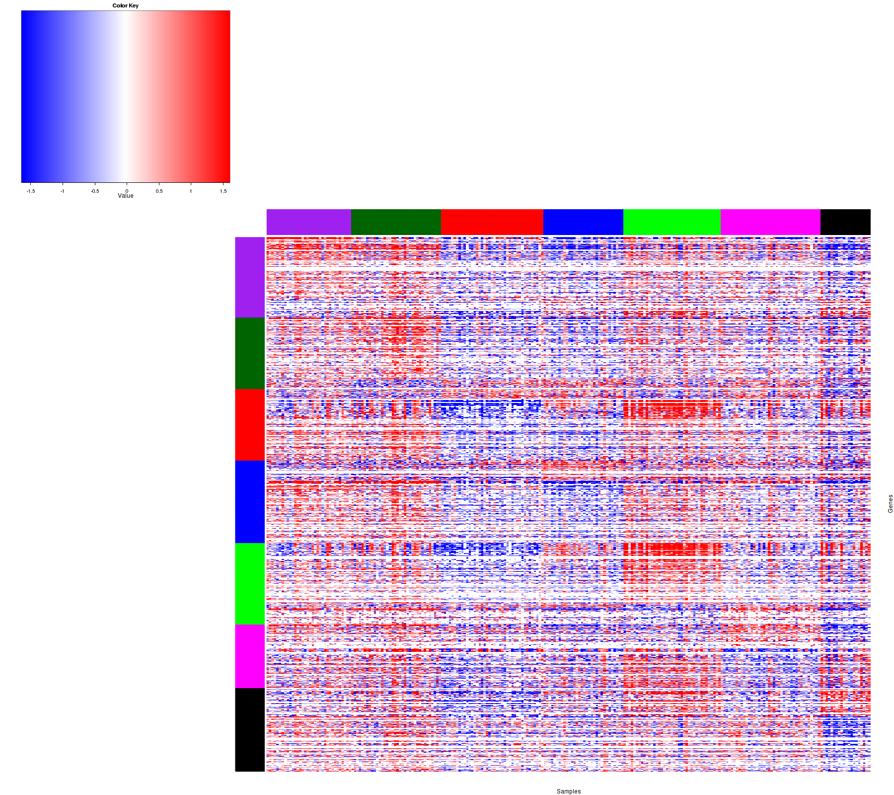 Figure 1. Get High-res Image Samples were separated into 7 clusters. Shown are 242 samples and 1294 marker miRs. The color bar of the row indicates the marker miRs for the corresponding cluster.