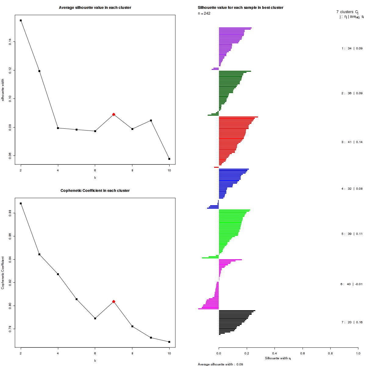 The cophenetic correlation coefficients and average silhouette values are used to determine the k with the most robust clusterings. From the plot of cophenetic correlation versus k, we select modes and the the point preceding the greatest decrease in cophenetic correlation coefficient, and from these choose the k with the highest average silhouette value.