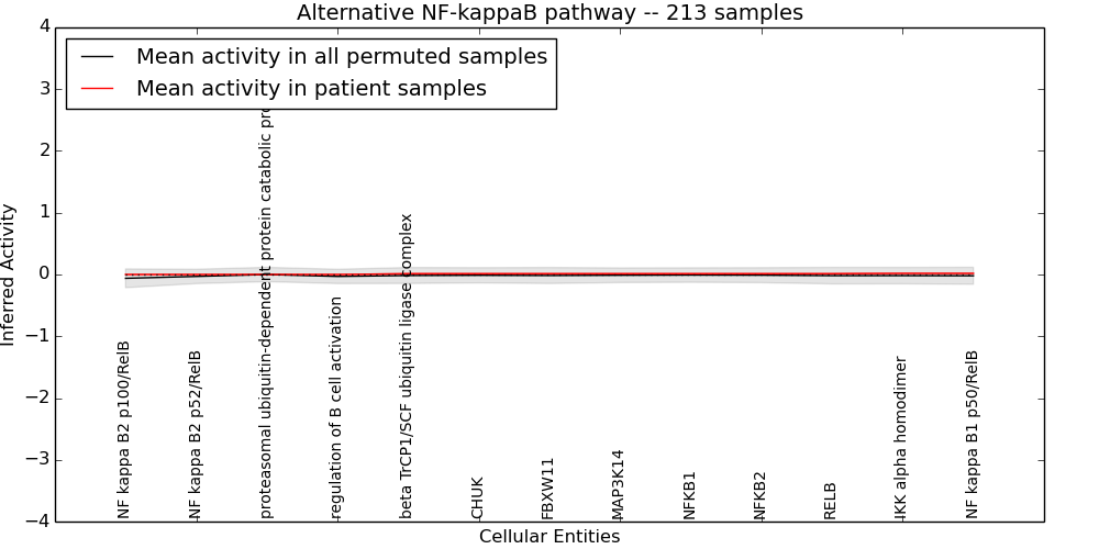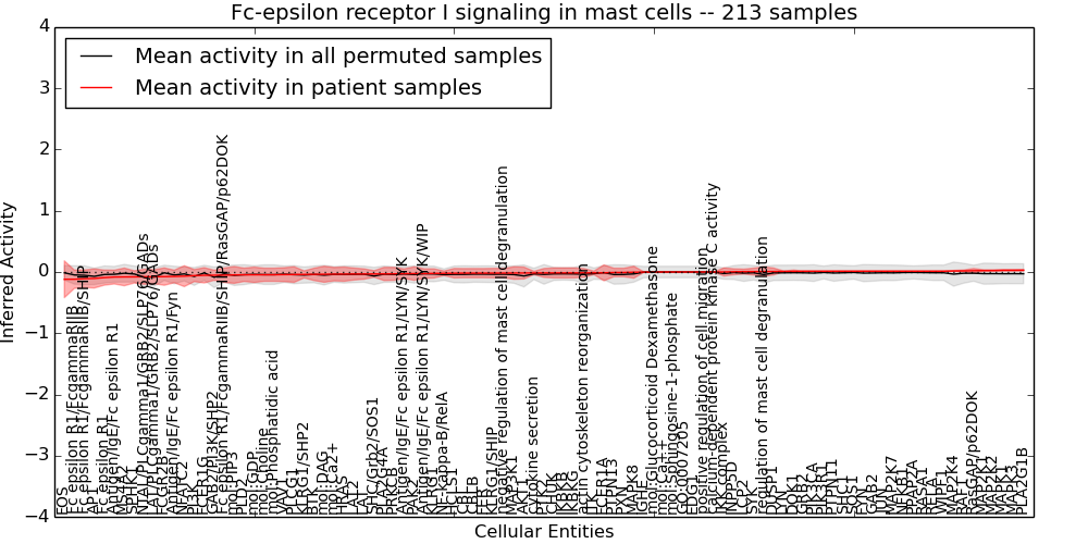 Figure S131.  Get High-res Image This plot shows pathway concept perturbations across all samples against a permutation model. The concepts along the x-axis are sorted by lowest to highest mean activity for the real patient samples. Mean inferred activities are plotted along the y-axis as a colored band showing the average level and one standard deviation range. Real samples are shown in red and permuted samples in black.