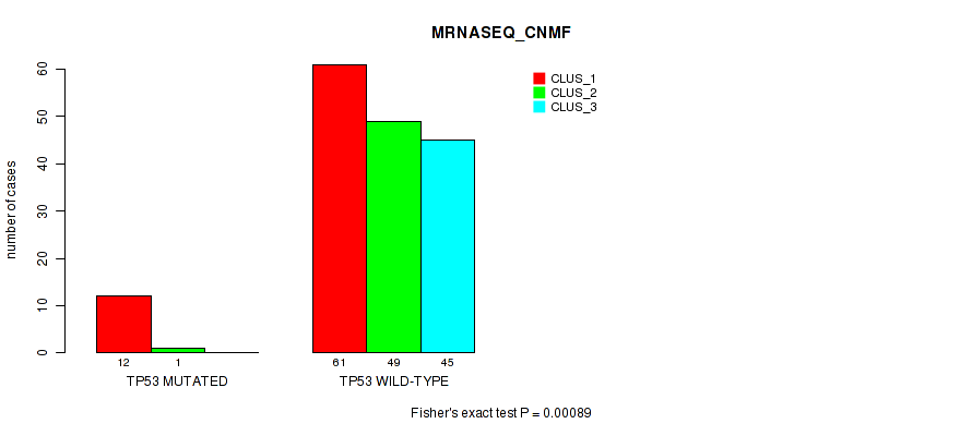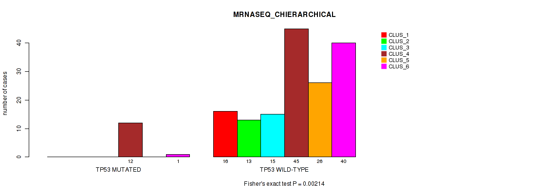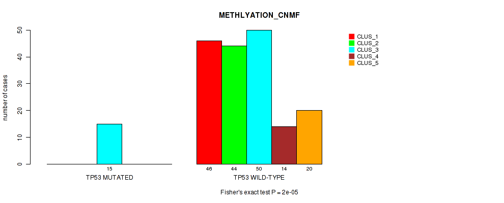 TP53 mutation correlated to 'CN_CNMF', 'METHLYATION_CNMF', 'MRNASEQ_CNMF', 'MIRSEQ_CNMF', and 'MIRSEQ_CHIERARCHICAL'.