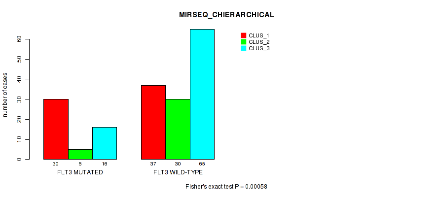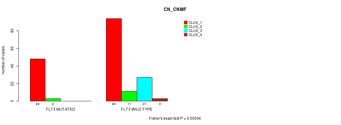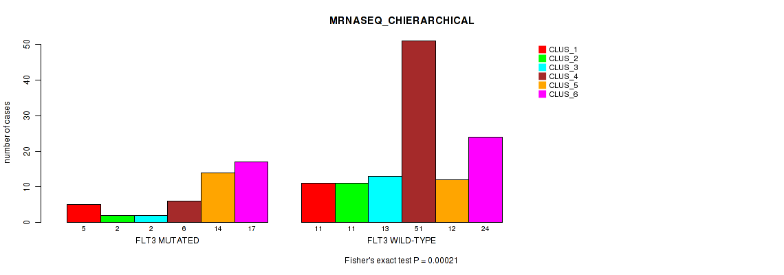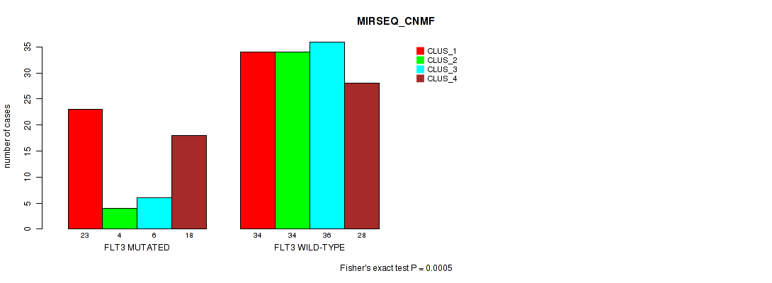 FLT3 mutation correlated to 'CN_CNMF', 'METHLYATION_CNMF', 'MRNASEQ_CNMF', 'MRNASEQ_CHIERARCHICAL', 'MIRSEQ_CNMF', and 'MIRSEQ_CHIERARCHICAL'.