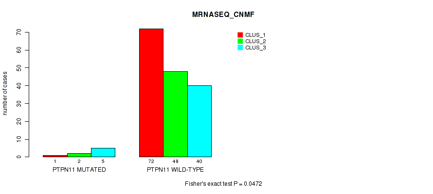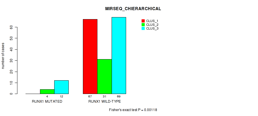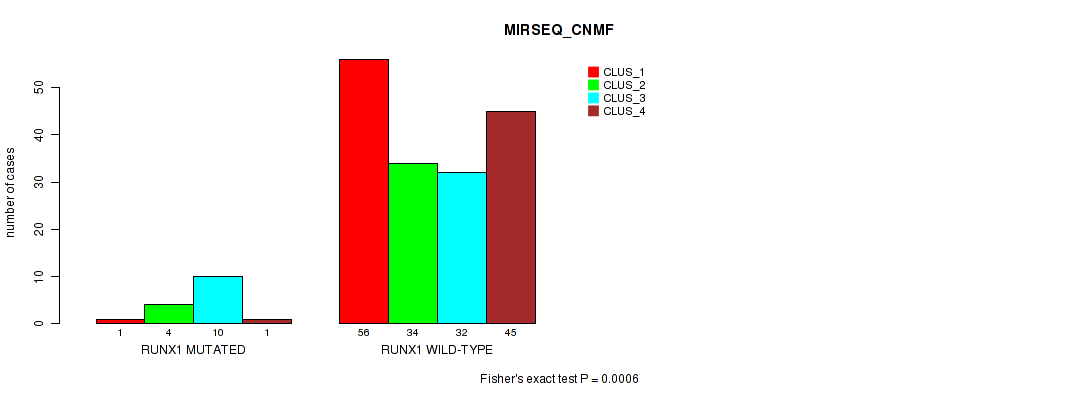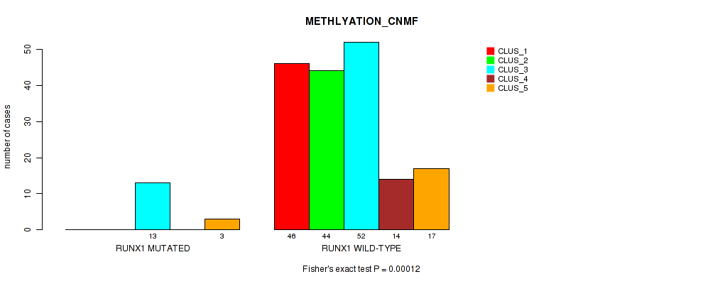 RUNX1 mutation correlated to 'METHLYATION_CNMF', 'MRNASEQ_CNMF', 'MRNASEQ_CHIERARCHICAL', 'MIRSEQ_CNMF', and 'MIRSEQ_CHIERARCHICAL'.