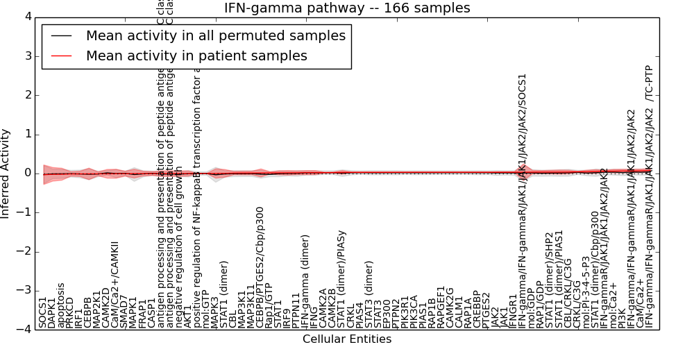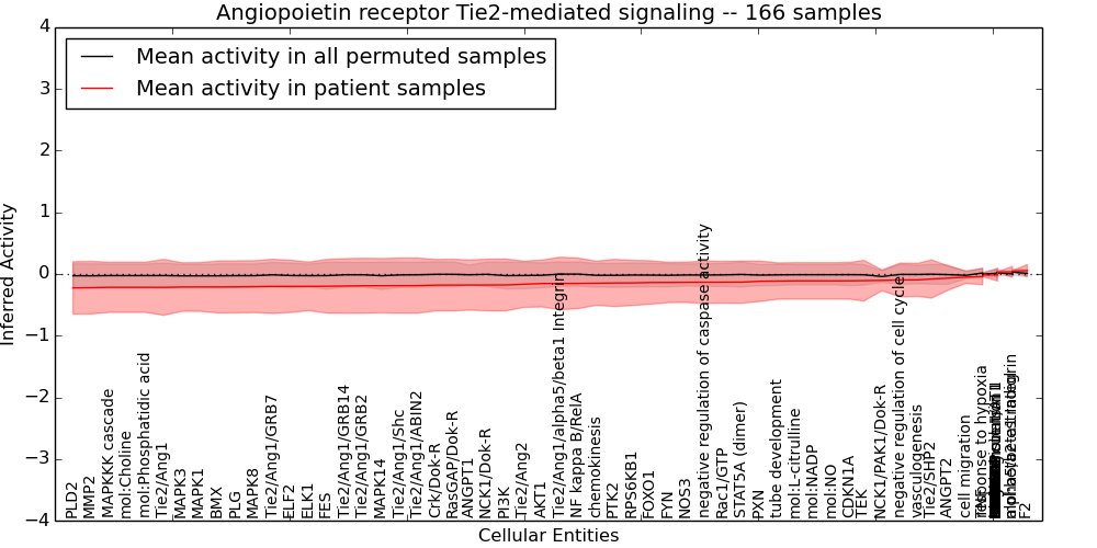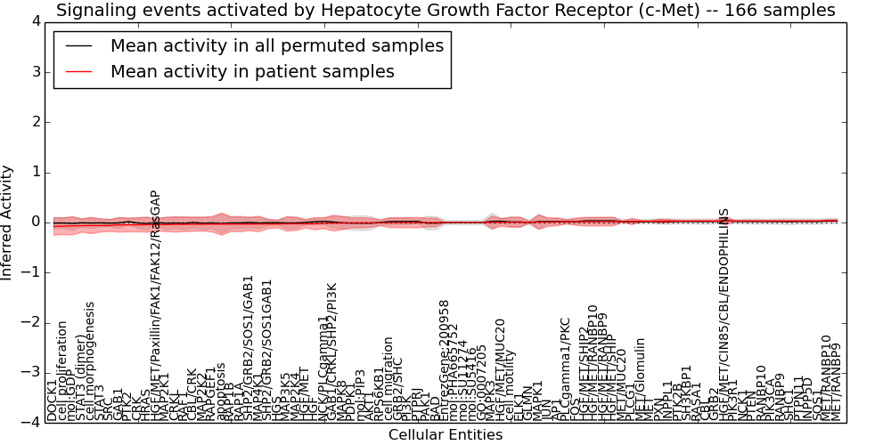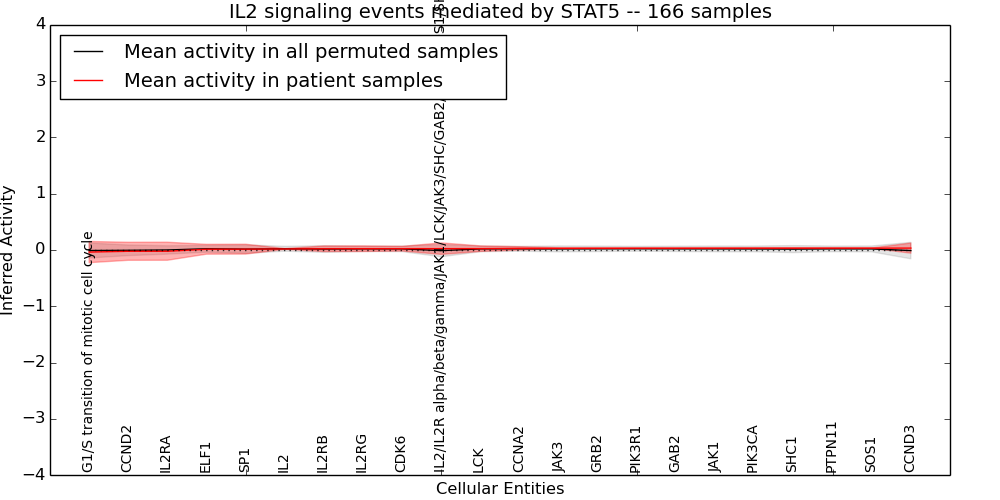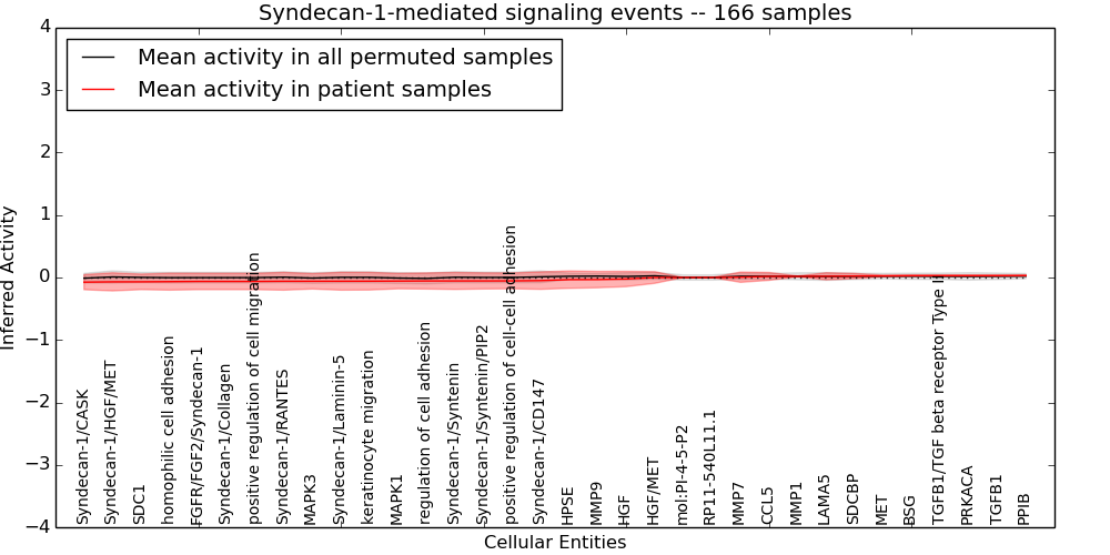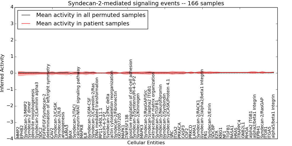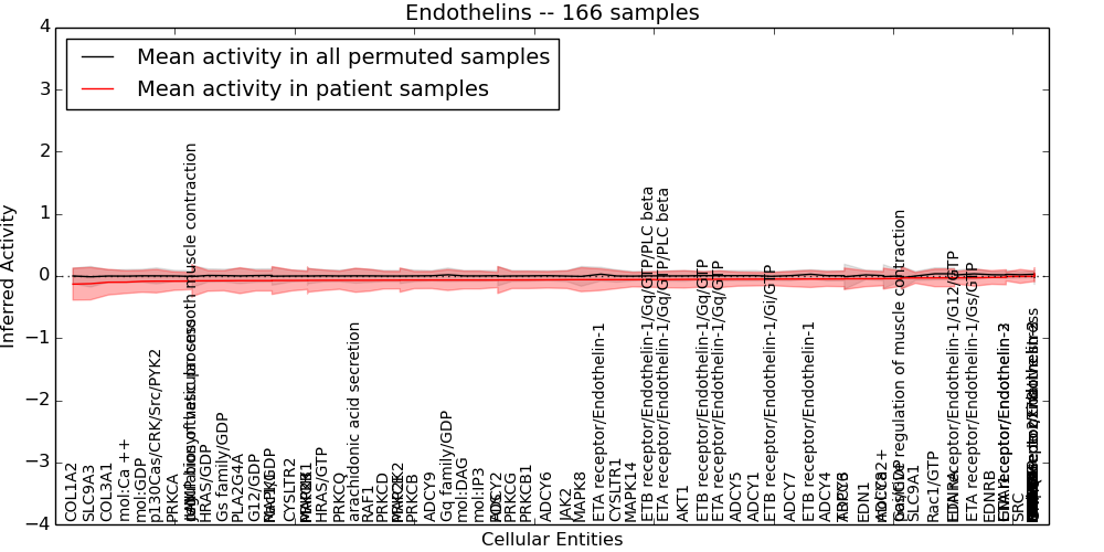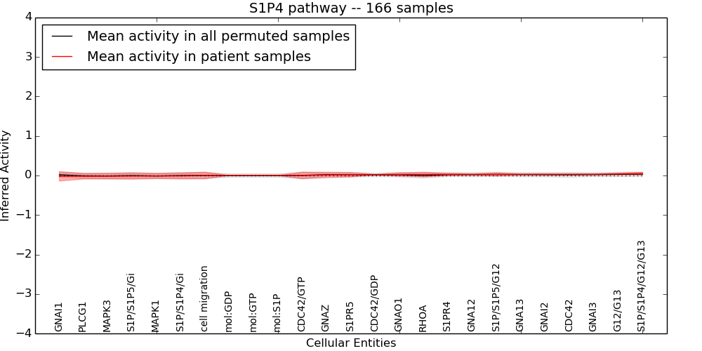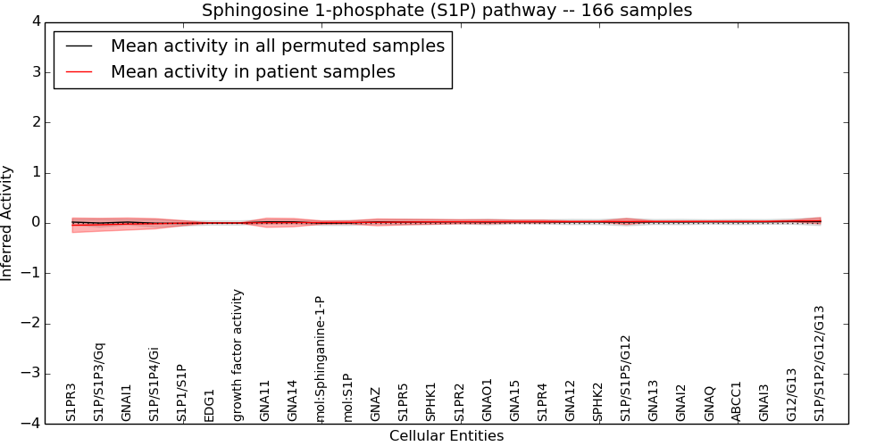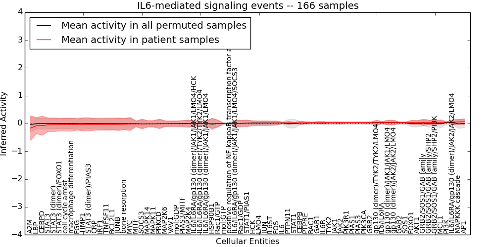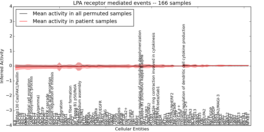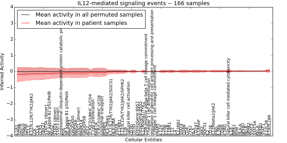 Figure S130. Get High-res Image This plot shows pathway concept perturbations across all samples against a permutation model. The concepts along the x-axis are sorted by lowest to highest mean activity for the real patient samples. Mean inferred activities are plotted along the y-axis as a colored band showing the average level and one standard deviation range. Real samples are shown in red and permuted samples in black.