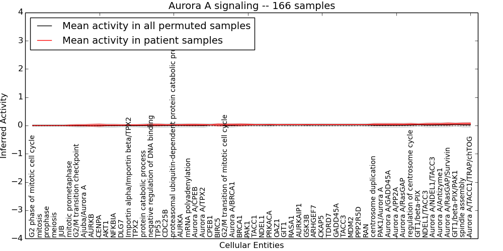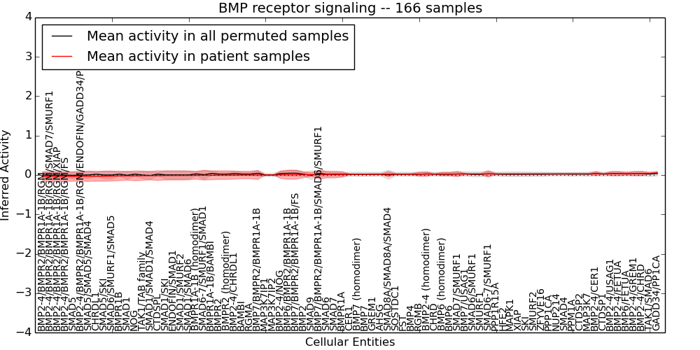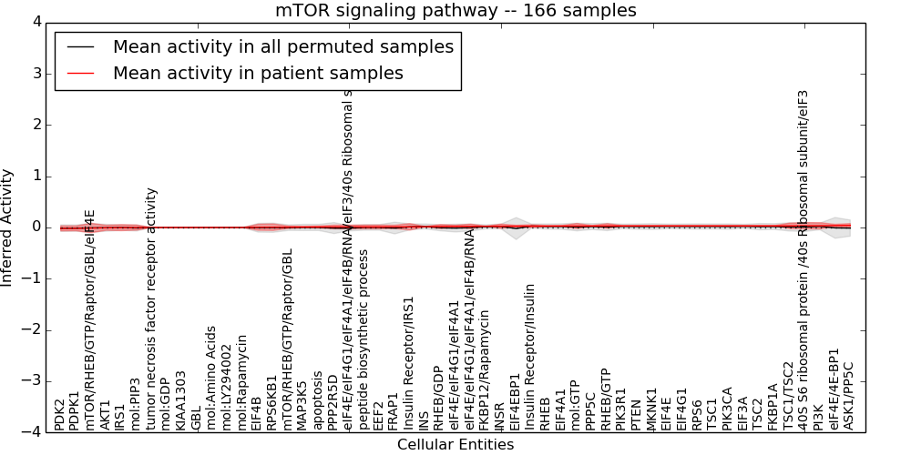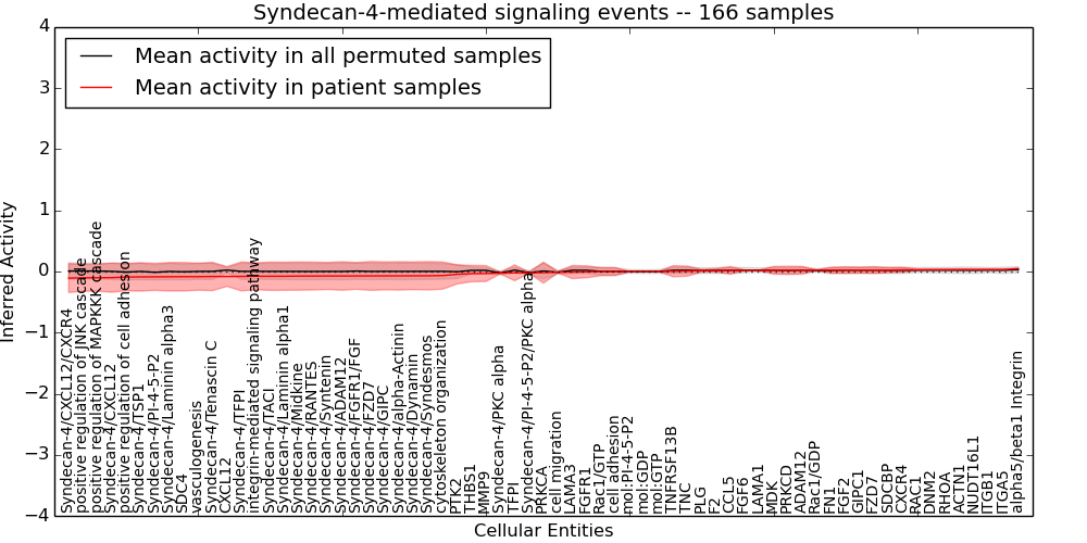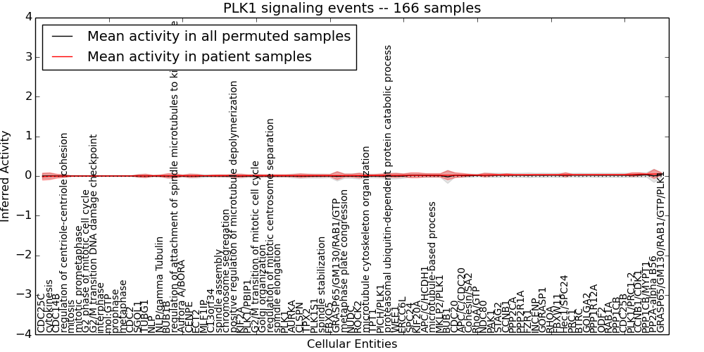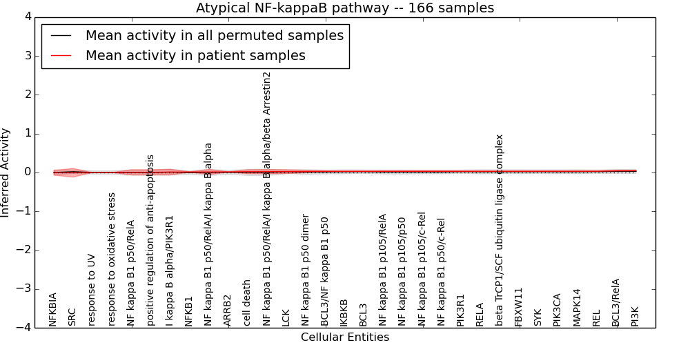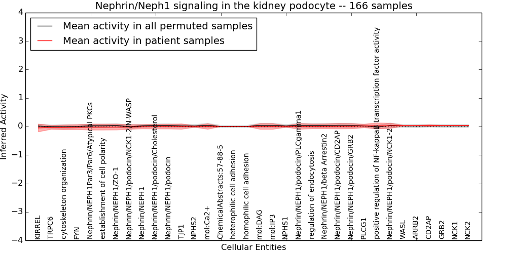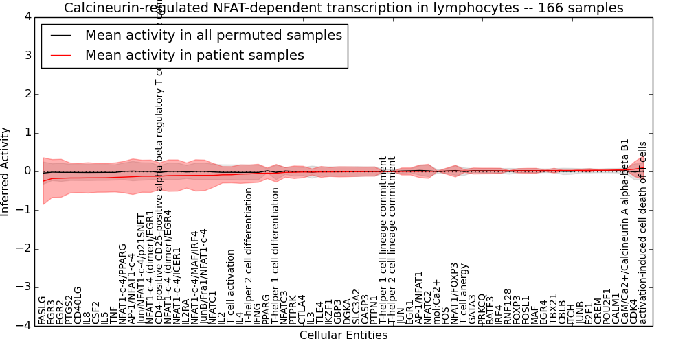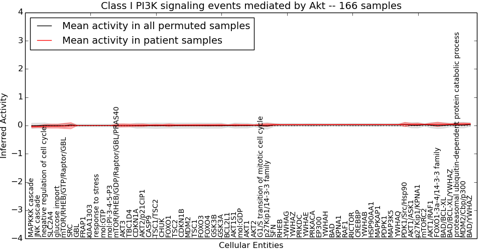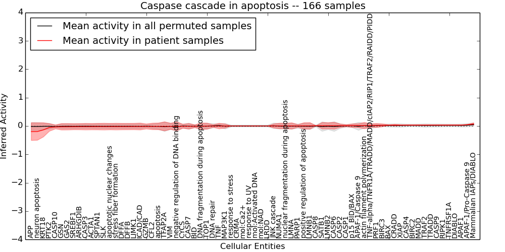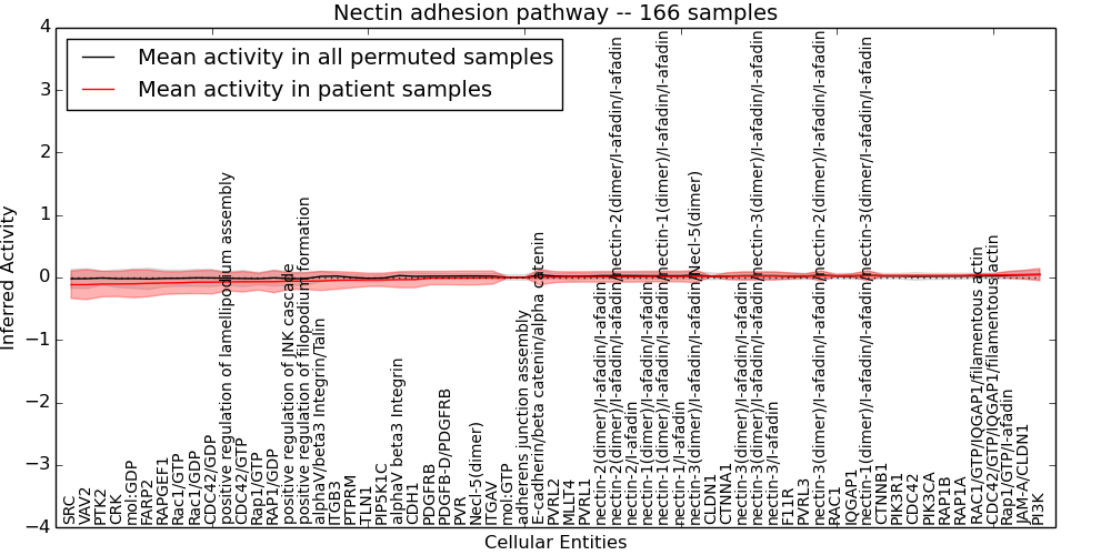 Figure S130. Get High-res Image This plot shows pathway concept perturbations across all samples against a permutation model. The concepts along the x-axis are sorted by lowest to highest mean activity for the real patient samples. Mean inferred activities are plotted along the y-axis as a colored band showing the average level and one standard deviation range. Real samples are shown in red and permuted samples in black.
