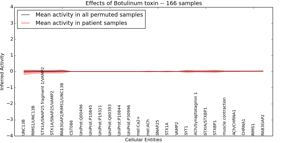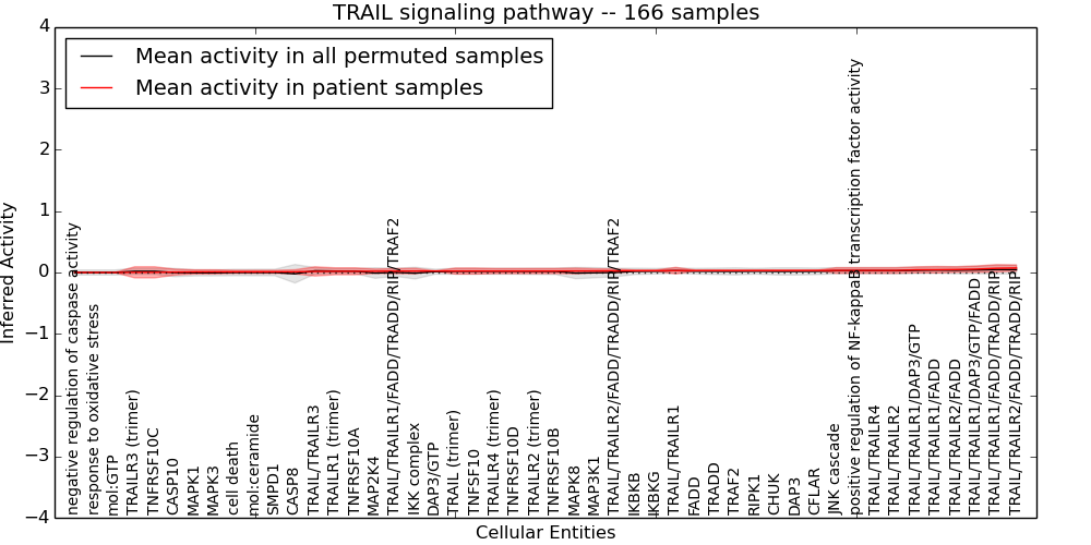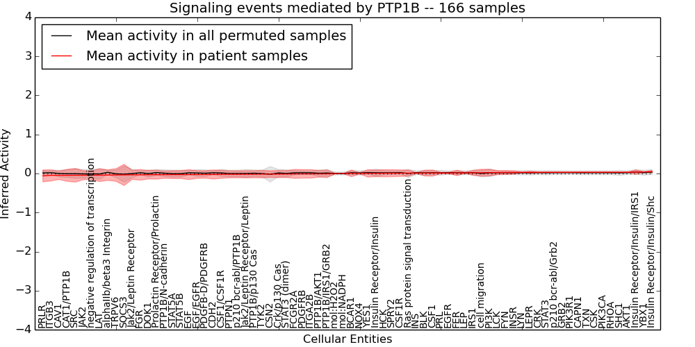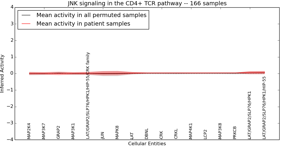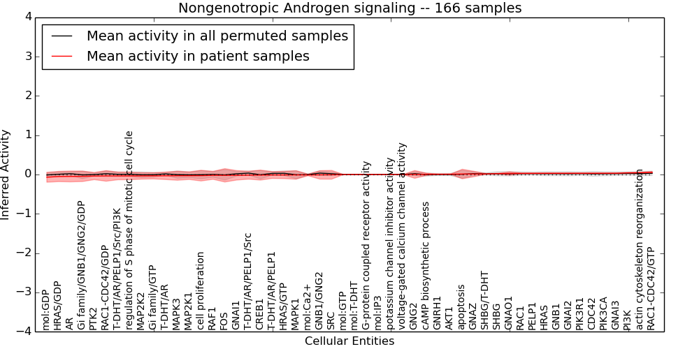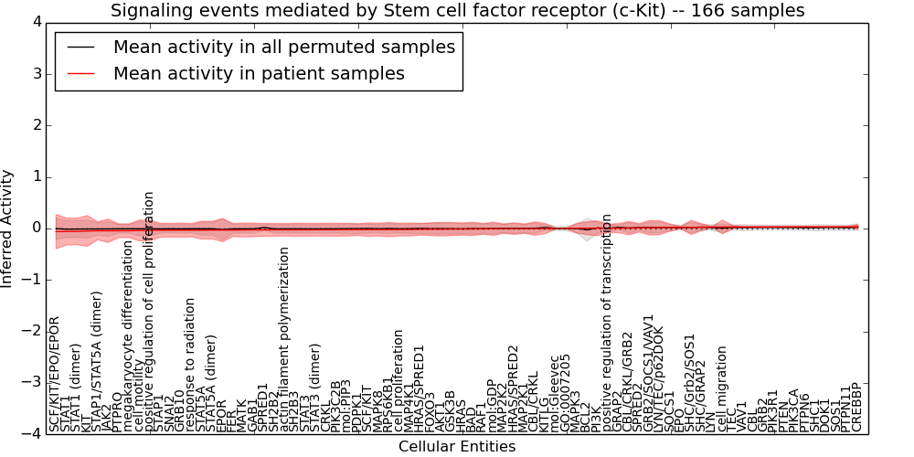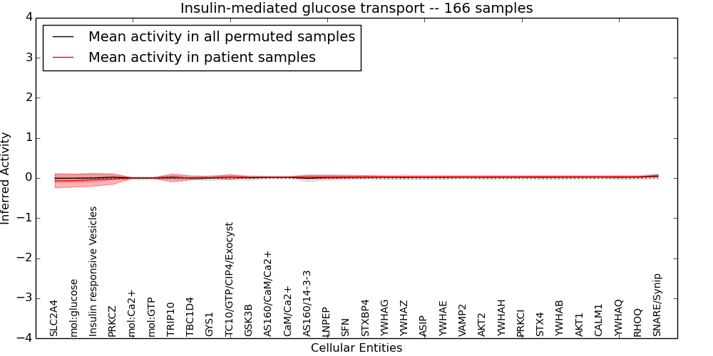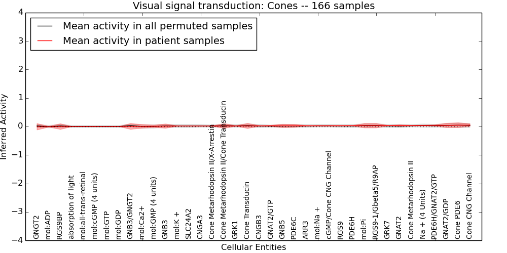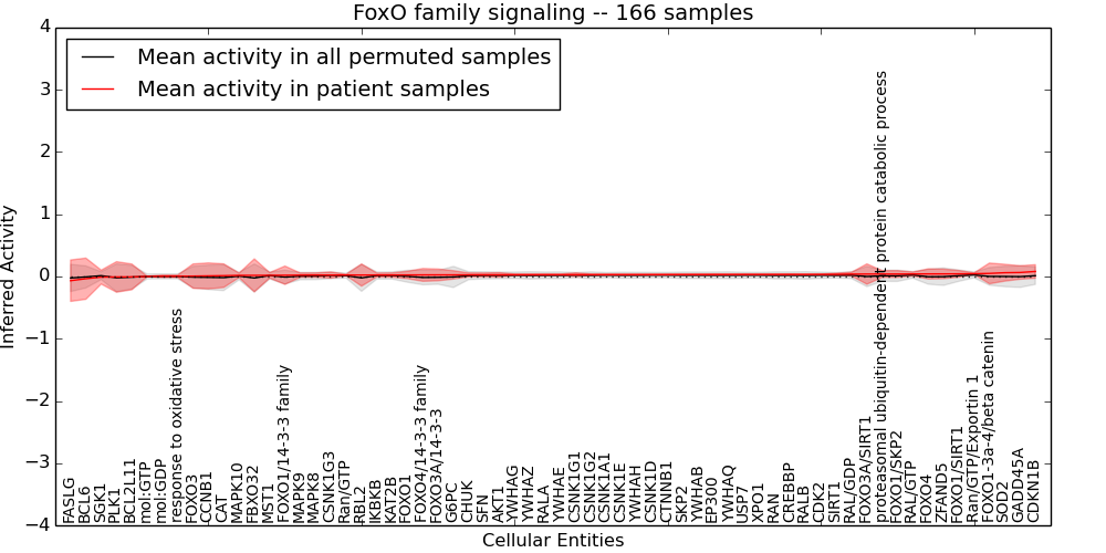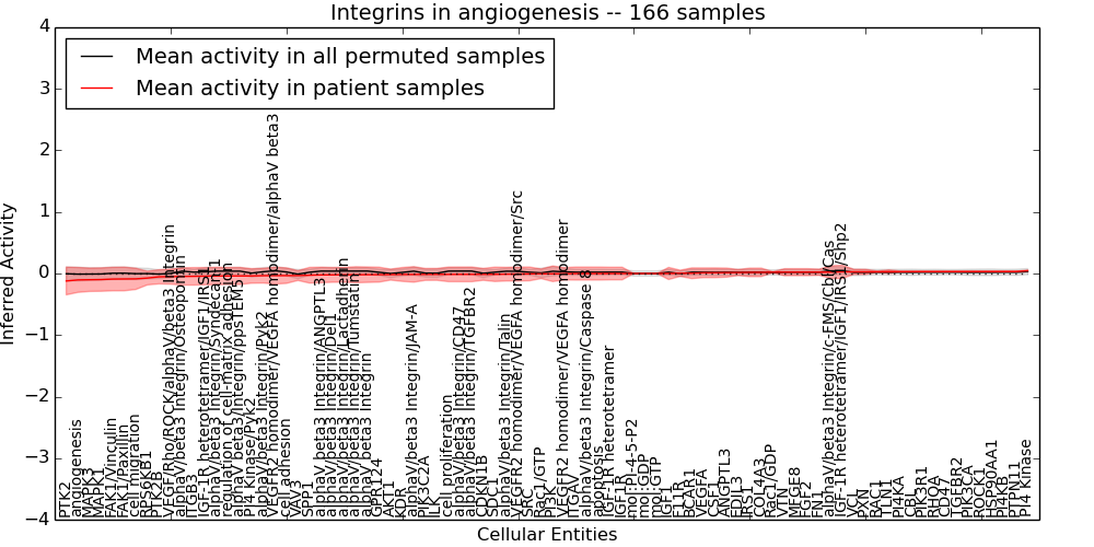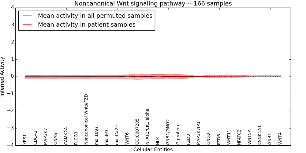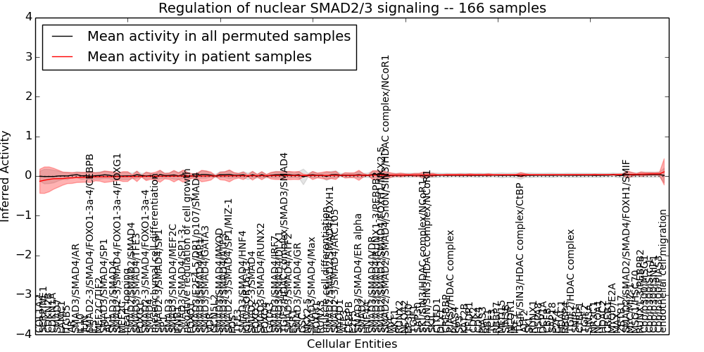 Figure S130. Get High-res Image This plot shows pathway concept perturbations across all samples against a permutation model. The concepts along the x-axis are sorted by lowest to highest mean activity for the real patient samples. Mean inferred activities are plotted along the y-axis as a colored band showing the average level and one standard deviation range. Real samples are shown in red and permuted samples in black.