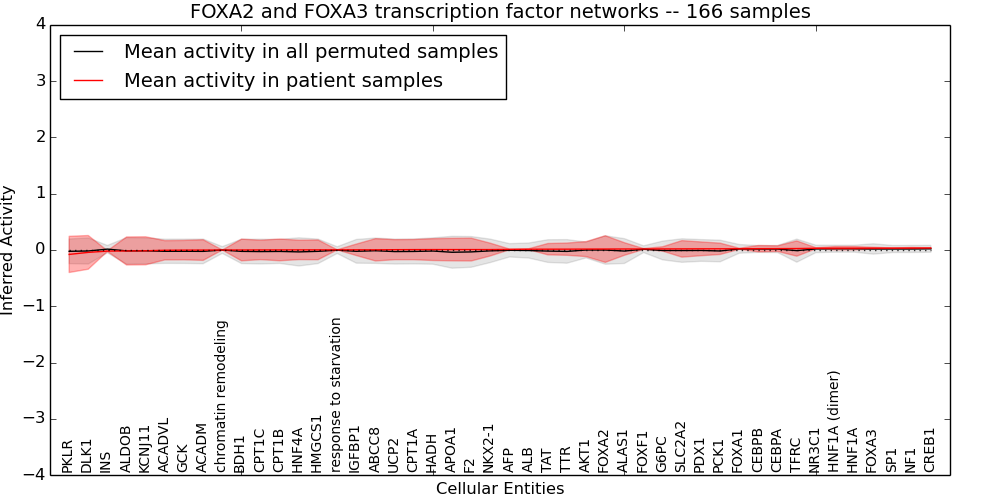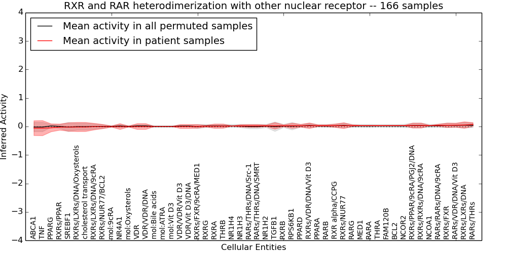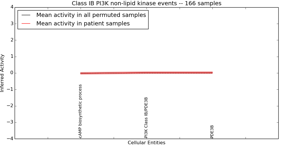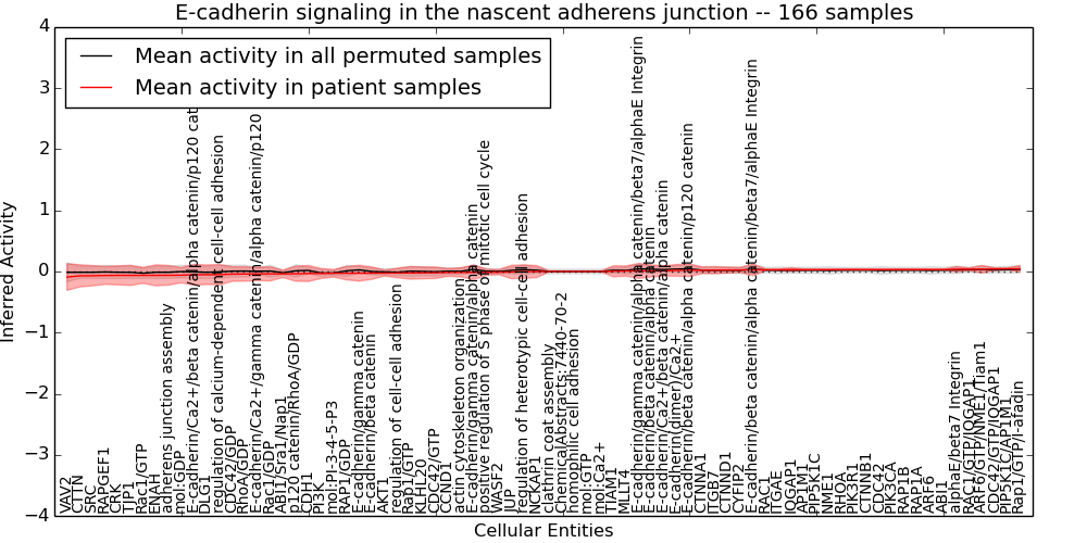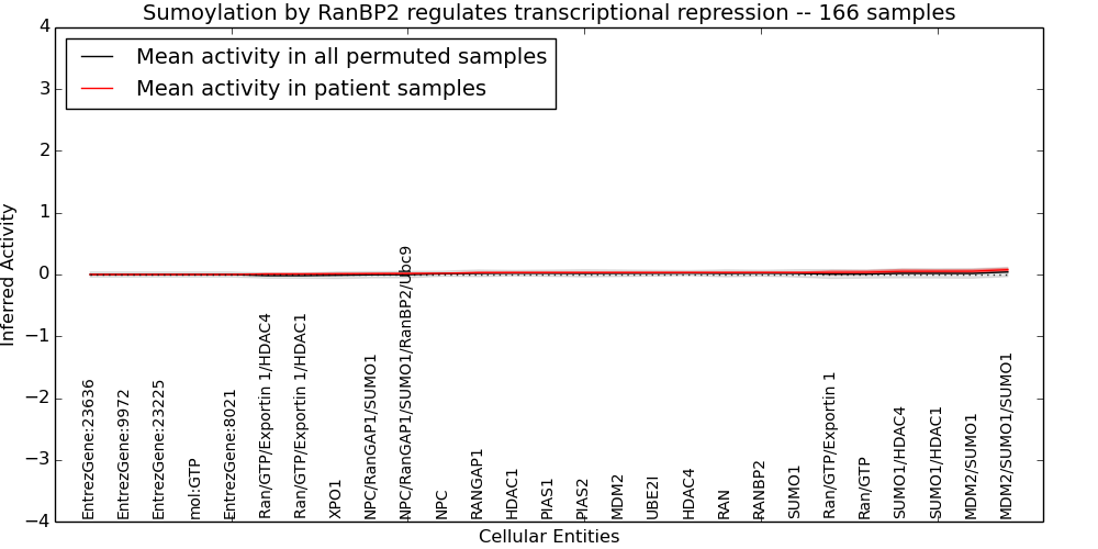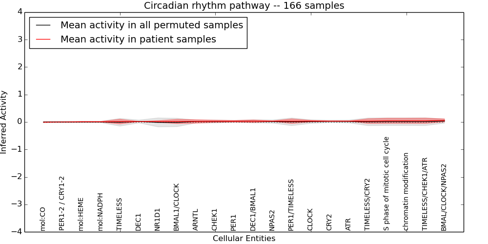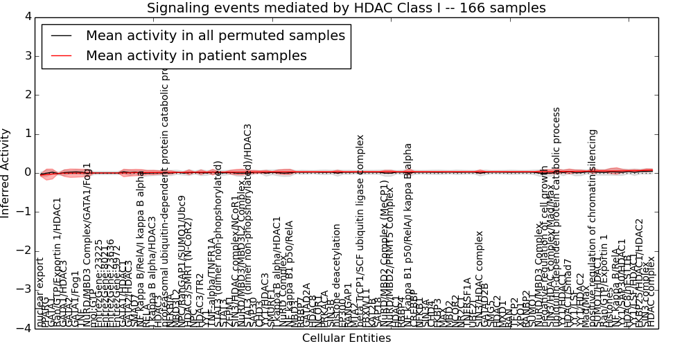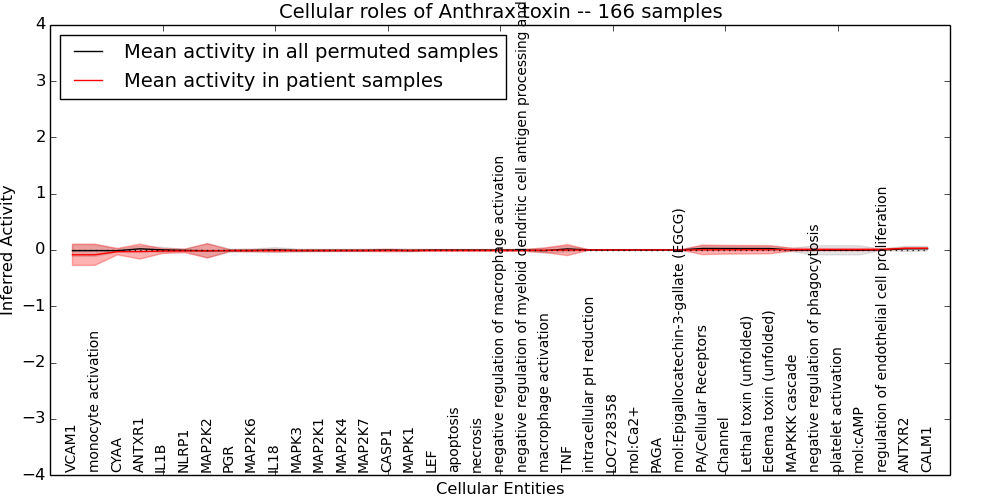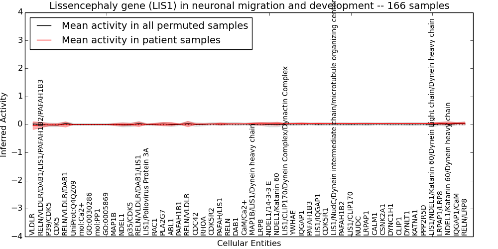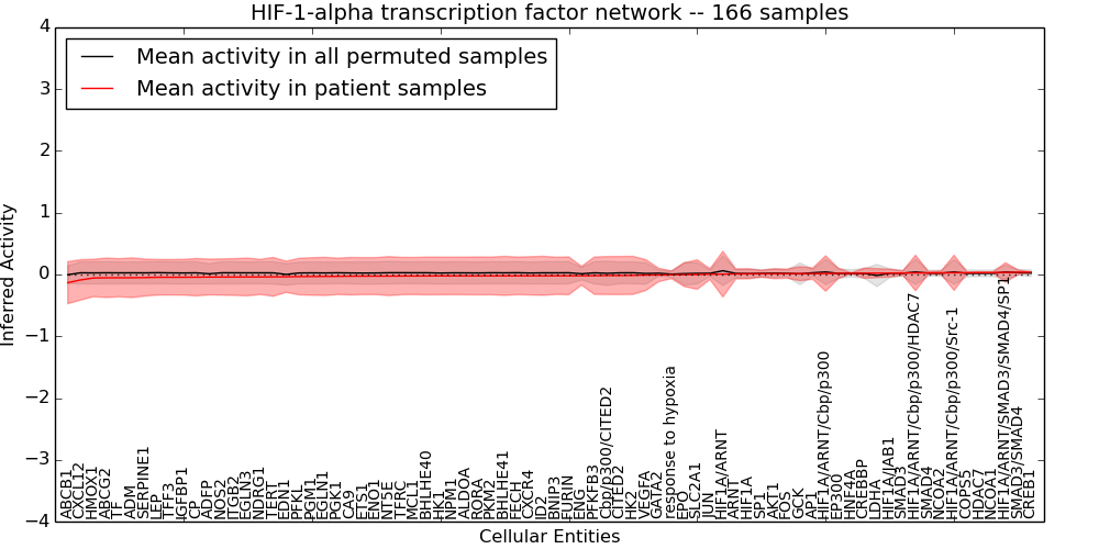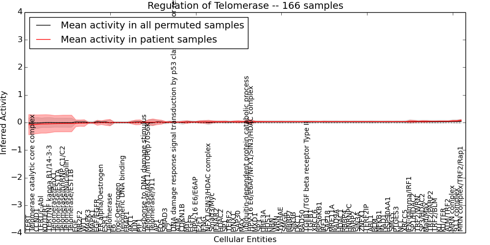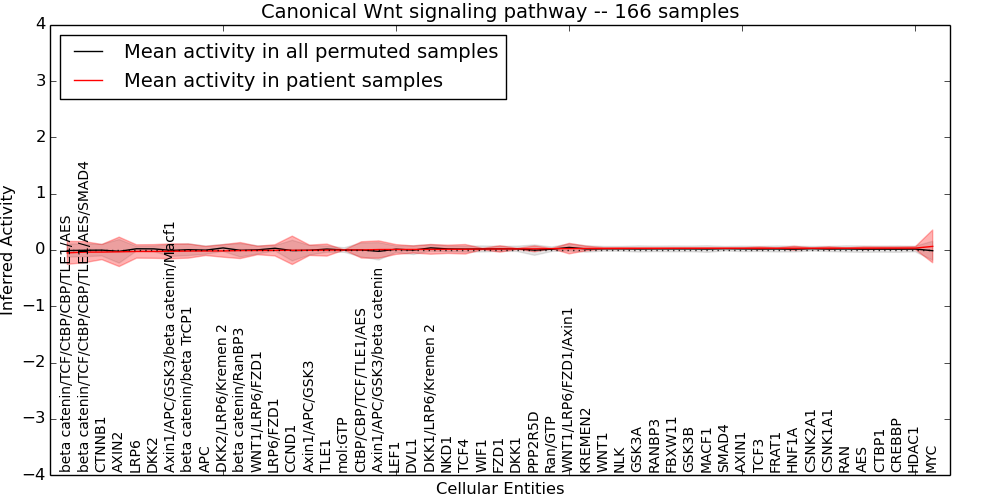 Figure S130. Get High-res Image This plot shows pathway concept perturbations across all samples against a permutation model. The concepts along the x-axis are sorted by lowest to highest mean activity for the real patient samples. Mean inferred activities are plotted along the y-axis as a colored band showing the average level and one standard deviation range. Real samples are shown in red and permuted samples in black.
