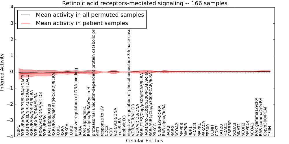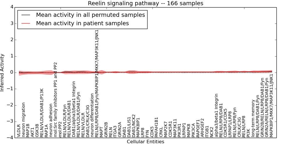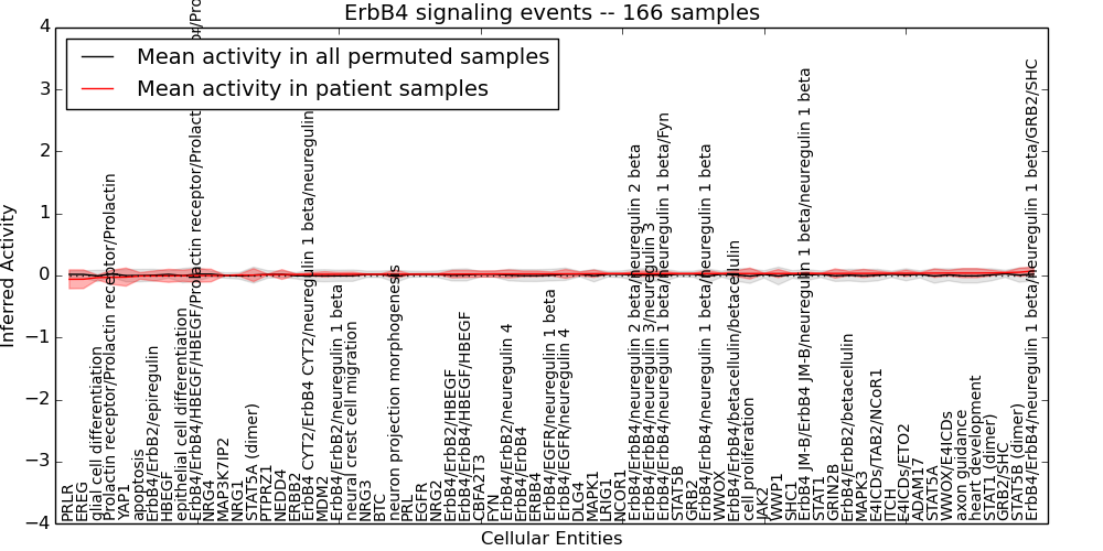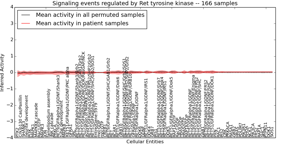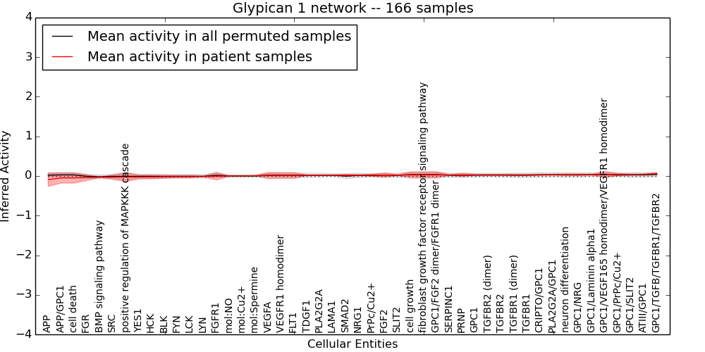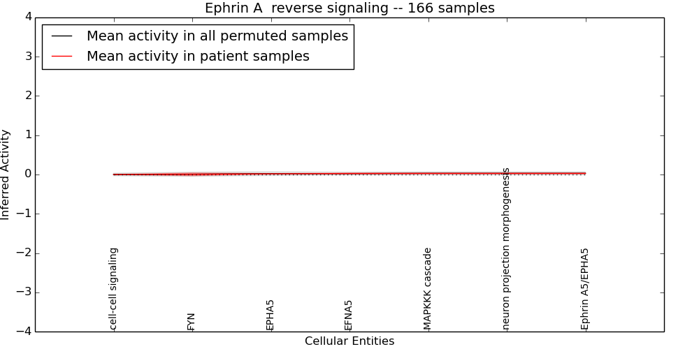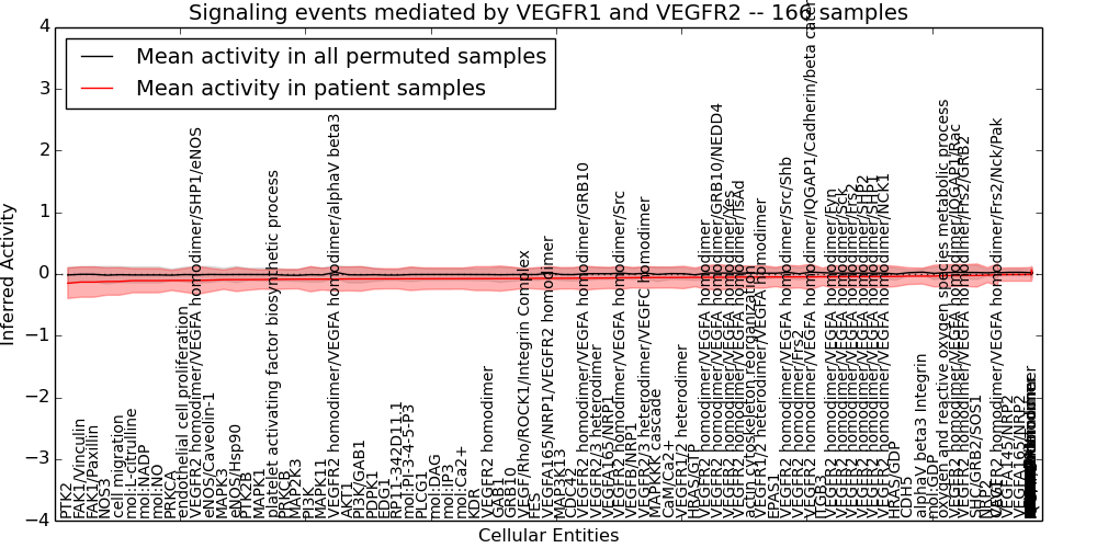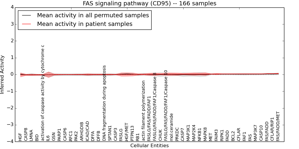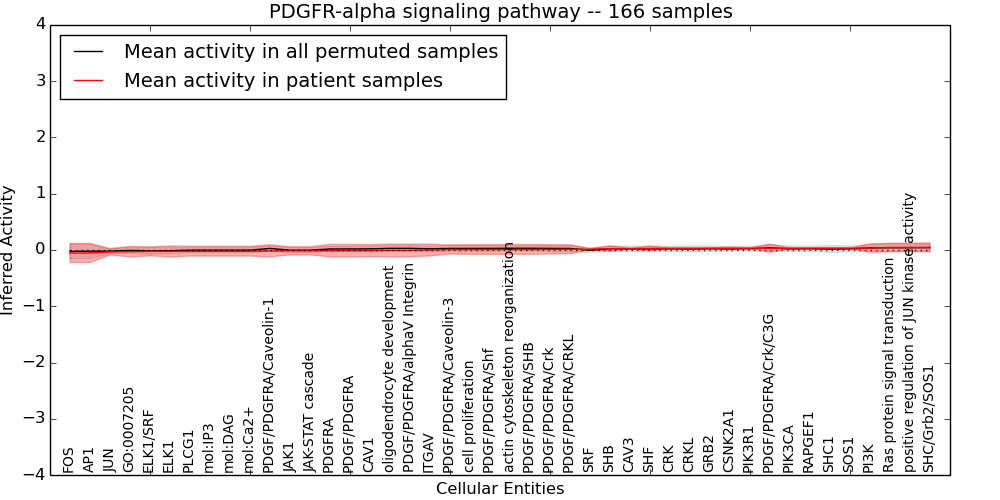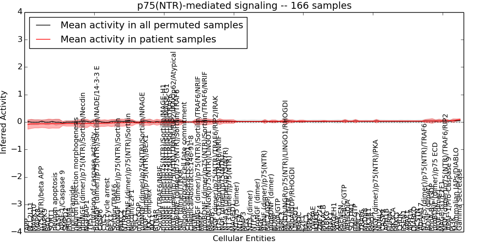 Figure S131. Get High-res Image This plot shows pathway concept perturbations across all samples against a permutation model. The concepts along the x-axis are sorted by lowest to highest mean activity for the real patient samples. Mean inferred activities are plotted along the y-axis as a colored band showing the average level and one standard deviation range. Real samples are shown in red and permuted samples in black.