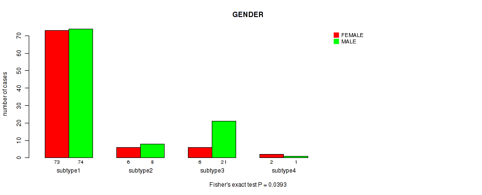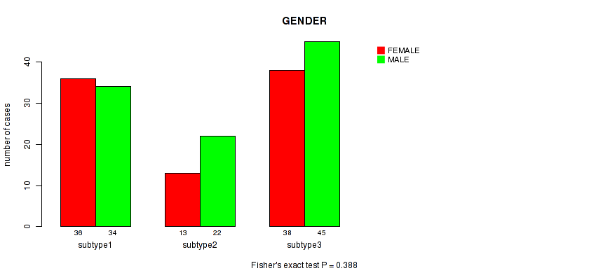 Figure S28. Get High-res Image Clustering Approach #6: 'MIRSEQ CHIERARCHICAL' versus Clinical Feature #3: 'GENDER'