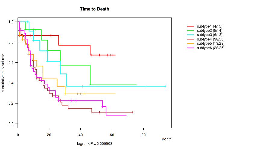 Consensus hierarchical clustering analysis on sequencing-based mRNA expression data identified 6 subtypes that correlate to 'Time to Death' and 'AGE'.