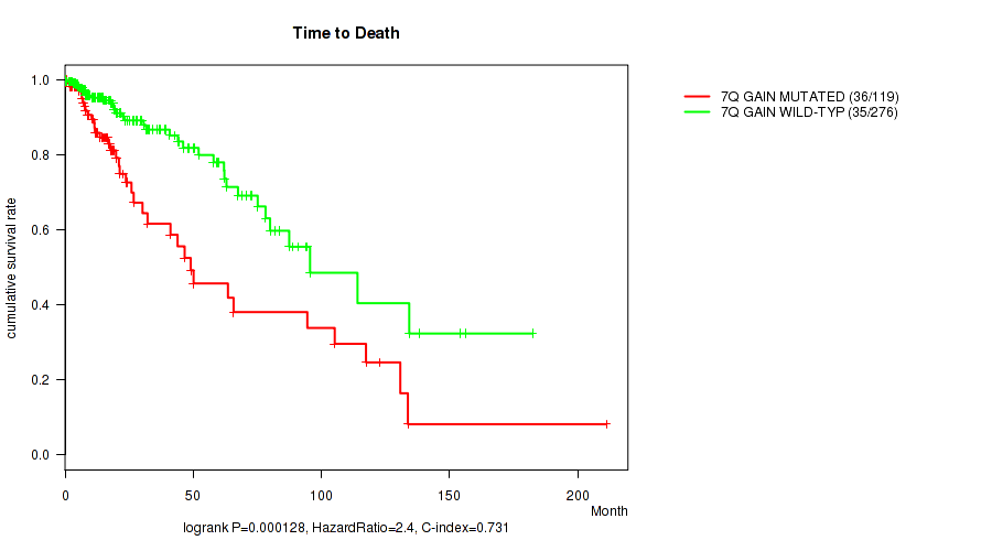 7q gain cnv correlated to 'Time to Death' and 'AGE'.